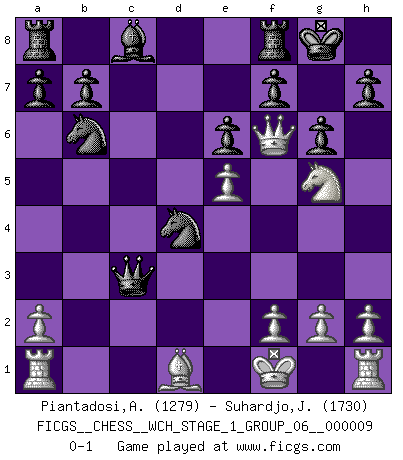 Last move : 0-1 2011 May 21 2:3:57 [Event "FICGS__CHESS__WCH_STAGE_1_GROUP_06__000009"] [Site "FICGS"] [Date "2011.04.15"] [Round "1"] [White "Piantadosi,Angelo"] [Black "Suhardjo,Johanes"] [Result "0-1"] [WhiteElo "1279"] [BlackElo "1730"] 1.e4 c5 2.c3 Nf6 3.e5 Nd5 4.d4 cxd4 5.cxd4 d6 6.Nf3 Nc6 7.Bc4 Nb6 8.Bb3 dxe5 9.Ng5 e6 10.Qh5 g6 11.Qf3 Qc7 12.dxe5 Nd4 13.Qf6 Qxc1+ 14.Bd1 Bb4+ 15.Nc3 Bxc3+ 16.bxc3 Qxc3+ 17.Kf1 O-O 0-1 Sicilian : Alapin's variation (2.c3) Kingside Castling by player Black (move 17) Player Black won this chess game. Follow this game move after move (download)Suddenly it was obvious to me in my analysis I had missed what Fischer had found with the greatest of ease at the board. (Mikhail Botvinnik) Kombinieren und Schwarzhandel gehören verboten. (Savielly Grigorievitsch Tartakower) EL Ajedrez es como la vida. (Boris Spassky) Le profane ne songe pas à la somme de jouissance dont il se prive, qui méconnaît ce jeu aux ressources aussi variées que passionnantes. (Jean-Marie Jeanton-Lamarche) He who is a good ruler must first have been ruled. (Aristotle)