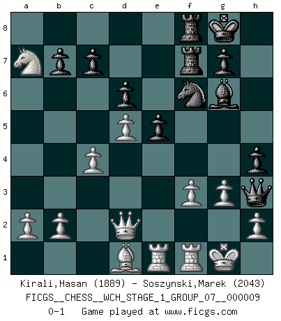 Last move : 0-1 2011 June 2 23:40:15 [Event "FICGS__CHESS__WCH_STAGE_1_GROUP_07__000009"] [Site "FICGS"] [Date "2011.04.01"] [Round "1"] [White "Kirali,Hasan"] [Black "Soszynski,Marek"] [Result "0-1"] [WhiteElo "1889"] [BlackElo "2043"] 1.d4 d6 2.c4 e5 3.d5 f5 4.e4 fxe4 5.Nc3 Nf6 6.Nge2 Bf5 7.Ng3 Bg6 8.Bg5 Be7 9.Bxf6 Bxf6 10.Ngxe4 O-O 11.Be2 Nd7 12.O-O Be7 13.f3 Bg5 14.Nxg5 Qxg5 15.Qc1 Qh4 16.Qd2 Rf7 17.Nb5 Nf6 18.g3 Qh3 19.Rae1 Raf8 20.Nxa7 h5 21.Bd1 h4 0-1 Old Indian defense Kingside Castling by player Black (move 10) Kingside Castling by player White (move 12) Player Black won this chess game. Follow this game move after move (download)For surely of all the drugs in the world, Chess must be the most permanently pleasurable. (Assiac) Schach sollte überall auf der Welt Schulfach werden. Es fördert die geistige Auseinandersetzung. Es lehrt die Demut in der Niederlage. (Garry Kasparov) El jugador táctico sabe que hacer cuando hay algo que hacer; mientras que el estratega sabe que hacer cuando no hay nada que hacer. (Gerald Abrahams) Les erreurs sont comme les malheurs, elles n'arrivent jamais seules. (Siegbert Tarrasch) Political correctness is subjecting us to gross incompetence. (Johann Piek)