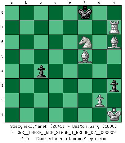 Last move : 1-0 2011 April 14 11:23:18 [Event "FICGS__CHESS__WCH_STAGE_1_GROUP_07__000009"] [Site "FICGS"] [Date "2011.04.01"] [Round "1"] [White "Soszynski,Marek"] [Black "Belton,Gary"] [Result "1-0"] [WhiteElo "2043"] [BlackElo "1800"] 1.e4 c5 2.d4 cxd4 3.Qxd4 Nc6 4.Qe3 Nf6 5.Nf3 d5 6.exd5 Nxd5 7.Qb3 a6 8.c4 Na5 9.Qa4+ Bd7 10.Qd1 Nb4 11.a3 Nbc6 12.b4 e5 13.bxa5 e4 14.Nfd2 Qxa5 15.Bb2 e3 16.fxe3 O-O-O 17.Be2 Bc5 18.O-O Bxe3+ 19.Kh1 f6 20.Bf3 Be6 21.Qe2 Qb6 22.Ne4 Na5 23.c5 Qb5 24.Nd6+ Rxd6 25.Qxb5 axb5 26.cxd6 Kd7 27.Re1 Nc4 28.Bc3 b6 29.a4 bxa4 30.Rxa4 b5 31.Rxc4 bxc4 32.Rxe3 Rd8 33.h4 Kxd6 34.Bb4+ Kd7 35.Nc3 Rb8 36.Bc5 g5 37.Bd1 Kc6 38.Ba7 Rb2 39.Rxe6+ Kb7 40.Be3 gxh4 41.Bf3+ Kb8 42.Rb6+ Kc7 43.Rxb2 Kd6 44.Rb5 h3 45.Bf4+ Ke6 46.Bg4+ f5 47.Bxf5+ Kf6 48.Ne4+ Kg7 49.Rb7+ Kh8 50.Rxh7+ Kg8 51.Nf6+ Kf8 52.Bh6+ 1-0 Sicilian : Smith-Morra gambit Queenside Castling by player Black (move 16) Kingside Castling by player White (move 18) 10 pieces endgame at move 47 : White KRBBNP , Black KPPP WHITE : King + 1 Rook 2 Bishops 1 Knight 1 Pawn BLACK : King + 3 Pawns 9 pieces endgame at move 50 : White KRBBNP , Black KPP WHITE : King + 1 Rook 2 Bishops 1 Knight 1 Pawn BLACK : King + 2 Pawns Player White won this chess game. Follow this game move after move (download)You know, comrade Pachman, I don't enjoy being a Minister, I would rather play Chess like you. (Che Guevara) Ich bin es gewohnt, das die Jugend mir überhaupt keinen Respekt entgegenbringt. (Alexander Morozewich) La estratégia requiere pensar, la táctica requiere observación. (Max Euwe) Vous m'avez demandé de vous exposer quel est le fondement de la prière. Je ne fais que préparer les pièces du jeu sur la table... Nous sera-t-il permis d'en adopter les règles et si nous les appliquons scrupuleusement nous ne tarderons pas à faire mat le Roi divin ! Il ne pourra échapper à nos mains. (Sainte Thérèse d'Avila, Chemin de perfection) Inventor: A person who makes an ingenious arrangement of wheels, levers and springs, and believes it civilization. (Ambrose Bierce, The Devil's Dictionary)