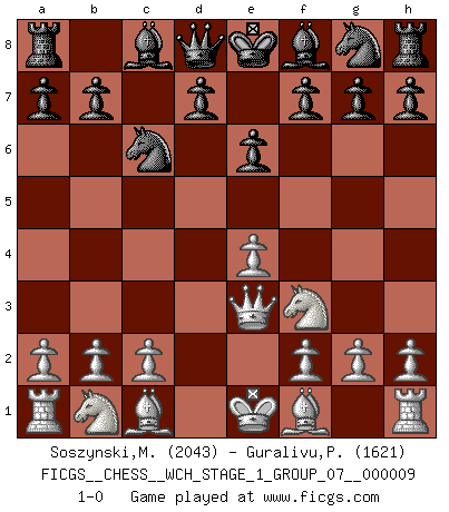 Last move : 1-0 2011 April 15 9:41:28 [Event "FICGS__CHESS__WCH_STAGE_1_GROUP_07__000009"] [Site "FICGS"] [Date "2011.04.01"] [Round "1"] [White "Soszynski,Marek"] [Black "Guralivu,Paul-Iosif"] [Result "1-0"] [WhiteElo "2043"] [BlackElo "1621"] 1.e4 c5 2.d4 cxd4 3.Qxd4 Nc6 4.Qe3 e6 5.Nf3 1-0 Sicilian : Smith-Morra gambit Player White won this chess game. Follow this game move after move (download)First-class players lose to second class players because second-class players sometimes play a first-class game. (Tarrasch) Garry Kasparov war erst in der Großmeister-Organisation GMA, dann in der Profischach-Vereinigung PCA, zum Schluss kehrte er wieder in den Schoß der FIDE zurück. Aber gut, manche Leute sind flexibel (Viswanathan Anand) Te sientas frente a un tablero y repentinamente tu corazón brinca. Tu mano tiembla al tomar una pieza y moverla. Pero lo que el Ajedrez te enseña es que tu debes permanecer ahí con calma y pensar de que si realmente es una buena idea o de que si hay otras ideas mejores. (Stanley Kubrick) RxDa4 pat (...) Tomorrow's what you make of it. (Horatio Caine, C.S.I. Miami)
