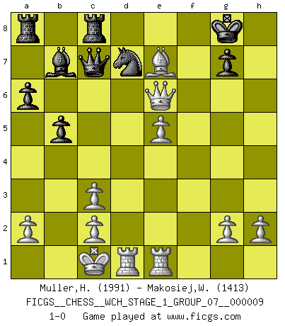 Last move : 1-0 2011 May 30 10:42:44 [Event "FICGS__CHESS__WCH_STAGE_1_GROUP_07__000009"] [Site "FICGS"] [Date "2011.04.01"] [Round "1"] [White "Muller,Henri-Louis"] [Black "Makosiej,Wladyslaw"] [Result "1-0"] [WhiteElo "1991"] [BlackElo "1413"] 1.e4 c5 2.Nf3 d6 3.d4 cxd4 4.Nxd4 Nf6 5.Nc3 a6 6.Bg5 e6 7.f4 Nbd7 8.Qf3 Qc7 9.O-O-O b5 10.Bd3 Bb7 11.Rhe1 Be7 12.Qg3 O-O 13.e5 dxe5 14.fxe5 Nd5 15.Bxe7 Nxc3 16.bxc3 Rfc8 17.Nxe6 fxe6 18.Bxh7+ Kxh7 19.Qh3+ Kg8 20.Qxe6+ 1-0 Sicilian : Najdorf, 7.f4 Queenside Castling by player White (move 9) Kingside Castling by player Black (move 12) Player White won this chess game. Follow this game move after move (download)An attack on the wing should be met by play in the center. (Nimzovitch) Frage: Gibt es etwas was Sie mehr lieben als Autobahnen ohne Tempobegrenzungen? - Antwort: Deutsche Frauen ohne Tempobegrenzungen. (Loek van Wely) Bobby es el jugador de Ajedrez mas fino que este país jamás haya producido. Su memoria para las movidas, su brillantez en soñar combinaciones y su feróz determinación por la victoria son algo extraño. (John Collins) Vouloir jouer aux échecs contre soi-même est aussi paradoxal que vouloir marcher sur son ombre. (Stefan Zweig) SEO proverb : Make your website optimized for human beings, not for search engines.