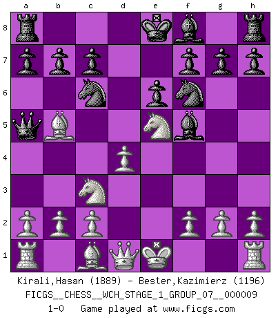 Last move : 1-0 2011 June 12 7:35:55 [Event "FICGS__CHESS__WCH_STAGE_1_GROUP_07__000009"] [Site "FICGS"] [Date "2011.04.01"] [Round "1"] [White "Kirali,Hasan"] [Black "Bester,Kazimierz"] [Result "1-0"] [WhiteElo "1889"] [BlackElo "1196"] 1.e4 d5 2.exd5 Qxd5 3.Nc3 Qa5 4.d4 Nf6 5.Nf3 Bf5 6.Bc4 e6 7.Ne5 Nc6 8.Bb5 1-0 This chess game has been lost on time (started : 2011.04.01 10:10:53) Scandinavian defense Player White won this chess game. Follow this game move after move (download)Openings teach you openings. Endgames teach you chess ! (Stephan Gerzadowicz) Der Knackpunkt bei der Konzentration ist, daß wir nur durch sie etwas Neues und Ungewöhnliches am Schachbrett finden können. Sie ist der einzige Weg durch neue neue Ideen eine Überraschung zu bereiten. (Garry Kasparov) Yo no creo en la psicología. Yo creo en las buenas movidas. (Bobby Fischer) Fischer est le meilleur joueur du monde et Karpov n'est qu'un joueur de bistrot. (Garry Kasparov, agé de 16 ans) Luck is when opportunity knocks and you answer. (Anonymous)