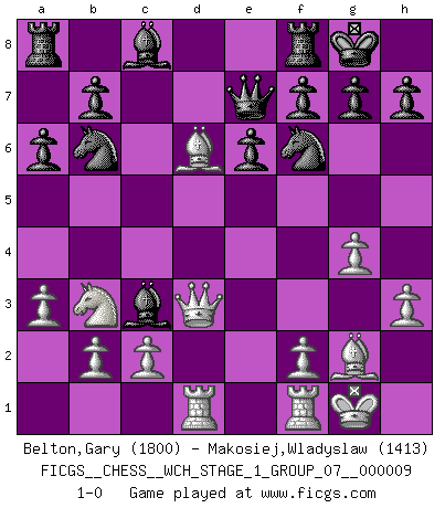 Last move : 1-0 2011 May 21 16:9:9 [Event "FICGS__CHESS__WCH_STAGE_1_GROUP_07__000009"] [Site "FICGS"] [Date "2011.04.01"] [Round "1"] [White "Belton,Gary"] [Black "Makosiej,Wladyslaw"] [Result "1-0"] [WhiteElo "1800"] [BlackElo "1413"] 1.e4 c5 2.Nf3 d6 3.d4 cxd4 4.Nxd4 Nf6 5.Nc3 a6 6.h3 e6 7.g4 d5 8.exd5 Nxd5 9.Bd2 Be7 10.Bg2 Nb6 11.Bf4 O-O 12.O-O N8d7 13.Bg3 Nf6 14.Qd3 Bc5 15.Rad1 Qe7 16.Nb3 Bb4 17.a3 Bxc3 18.Bd6 1-0 Sicilian : Najdorf, Adams attack Kingside Castling by player Black (move 11) Kingside Castling by player White (move 12) Player White won this chess game. Follow this game move after move (download)What would Chess be without silly mistakes ? (Kurt Richter) Es hat in meinem Leben Zeiten gegeben, da ich sehr nahe daran war zu glauben, daß ich auch nicht eine einzige Schachpartie verlieren könnte. (José Raúl Capablanca) Mis oponentes también hacen buenas movidas. A veces yo no tomo esas cosas en consideración. (Bobby Fischer) Vous n'êtes pas toujours obligé de jouer le meilleur coup. Un coup doit être actif, entreprenant, correct et beau ! (David Bronstein) If you know the enemy and know yourself you need not fear the results of a hundred battles. (Sun Tzu)