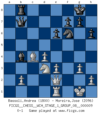 Last move : 0-1 2011 August 20 9:51:49 [Event "FICGS__CHESS__WCH_STAGE_1_GROUP_08__000009"] [Site "FICGS"] [Date "2011.04.01"] [Round "1"] [White "Bassoli,Andrea"] [Black "Moreira,Jose"] [Result "0-1"] [WhiteElo "1800"] [BlackElo "2096"] 1.d4 d5 2.c4 dxc4 3.Nf3 Nf6 4.e3 e6 5.Bxc4 c5 6.O-O Qc7 7.Qe2 a6 8.Bd3 Nc6 9.a3 Bd7 10.Nbd2 cxd4 11.exd4 Be7 12.Nc4 Rc8 13.Bd2 O-O 14.g3 b5 15.Nce5 h6 16.a4 Qb7 17.axb5 axb5 18.Nxd7 Qxd7 19.Be3 b4 20.Rfc1 Rfd8 21.Kg2 b3 22.Bb5 Qd5 23.Ba6 Ra8 24.Bc4 Qe4 25.Rxa8 Rxa8 26.Kg1 Nb4 27.Nd2 Qc6 28.Nxb3 Nbd5 29.Nc5 Nxe3 30.fxe3 Rb8 31.Nd3 Qa8 32.Rf1 Qb7 33.Re1 Bb4 0-1 This chess game has been lost on time (started : 2011.04.01 10:12:50) QGA : Classical variation, 6.O-O Kingside Castling by player White (move 6) Kingside Castling by player Black (move 13) Player Black won this chess game. Follow this game move after move (download)When in doubt... play Chess ! (Tevis) Die westlichen Werte sind eine Sprache, welche die Putin-Administration nicht versteht. (Garry Kasparov) En el Ajedrez, tal como en la vida, las bendiciones de hoy pueden ser el veneno del mañana. (Assaic) Les échecs sont plus proches de l'art de l'assassinat que de l'art de la guerre. (Arturo Perez-Reverte) The meaning of life is that it is to be lived, and it is not to be traded and conceptualized and squeezed into a pattern of systems. (Bruce Lee)