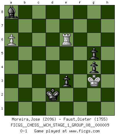 Last move : 0-1 2011 August 7 21:26:47 [Event "FICGS__CHESS__WCH_STAGE_1_GROUP_08__000009"] [Site "FICGS"] [Date "2011.04.01"] [Round "1"] [White "Moreira,Jose"] [Black "Faust,Dieter"] [Result "0-1"] [WhiteElo "2096"] [BlackElo "1755"] 1.e4 c5 2.Nf3 d6 3.d4 cxd4 4.Nxd4 Nf6 5.Nc3 g6 6.Be3 Bg7 7.f3 O-O 8.Qd2 Nc6 9.Bc4 Bd7 10.h4 Ne5 11.Bb3 h5 12.O-O-O Rc8 13.Bh6 Nc4 14.Bxc4 Rxc4 15.Bxg7 Kxg7 16.g4 hxg4 17.h5 Rh8 18.hxg6 fxg6 19.f4 e5 20.Nde2 Rxh1 21.Rxh1 Nxe4 22.Nxe4 Rxe4 23.fxe5 Rxe2 24.Qxe2 Qg5+ 25.Qd2 Qxd2+ 26.Kxd2 dxe5 27.Ke3 Bc6 28.Rg1 Bf3 29.b4 Kf6 30.a4 e4 31.a5 Ke5 32.c4 a6 33.b5 Kd6 34.Rb1 Kc5 35.bxa6 bxa6 36.Rb6 Kxc4 37.Kf2 g5 38.Kg3 e3 39.Rxa6 Kd3 40.Rd6+ Kc2 41.Re6 Kd2 42.a6 Ba8 0-1 This chess game has been lost on time (started : 2011.04.01 10:12:50) Sicilian : Dragon, Yugoslav attack, 7...O-O Kingside Castling by player Black (move 7) Queenside Castling by player White (move 12) 10 pieces endgame at move 35 : White KRPP , Black KBPPPP WHITE : King + 1 Rook 2 Pawns BLACK : King + 1 Bishop 4 Pawns 9 pieces endgame at move 36 : White KRP , Black KBPPPP WHITE : King + 1 Rook 1 Pawn BLACK : King + 1 Bishop 4 Pawns 8 pieces endgame at move 39 : White KRP , Black KBPPP WHITE : King + 1 Rook 1 Pawn BLACK : King + 1 Bishop 3 Pawns Player Black won this chess game. Follow this game move after move (download)A great player and a great example for many. His book My 60 Memorable Games had a big impact on me. It is a shame he didn't continue to enrich the world of chess with his unparalleled understanding after 1972. (Jan Timman, about Bobby Fischer's death) Schach ist ein Teil der Kultur, und wenn es mit der Kultur abwärts geht, geht es auch mit dem Schach abwärts. (Mikhail Moiseyevich Botvinik) Si el Ajedrez es una ciencia, es la mas inexacta. Si el Ajedrez es un arte, es demasiado inexacto para ser visto como tal. Si el Ajedrez es un deporte, es demasiado esotérico. Si el Ajedrez es un juego, es demasiado exigente para ser solo un juego. Si el Ajedrez es una aventura, es una muy demandante. Si el Ajedrez es una pasión, es una muy gratificante. Si el Ajedrez es la vida, es una muy triste. (Anónimo) Les échecs, c'est l'imagination. (David Bronstein) If computers get too powerful, we can organize them into committees. That'll do them in. (Anonymous)
