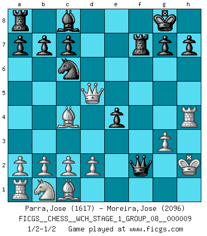 Last move : 1/2-1/2 2011 May 3 1:27:1 [Event "FICGS__CHESS__WCH_STAGE_1_GROUP_08__000009"] [Site "FICGS"] [Date "2011.04.01"] [Round "1"] [White "Parra,Jose"] [Black "Moreira,Jose"] [Result "1/2-1/2"] [WhiteElo "1617"] [BlackElo "2096"] 1.e4 e5 2.Nf3 Nc6 3.Bc4 Nf6 4.Ng5 Bc5 5.Nxf7 Bxf2+ 6.Kxf2 Nxe4+ 7.Ke3 Qh4 8.g3 Nxg3 9.hxg3 Qd4+ 10.Kf3 d5 11.Rh4 e4+ 12.Kg2 O-O 13.Qh5 Rxf7 14.Qxd5 Qf2+ 15.Kh1 Qe1+ 16.Kh2 Qf2+ 1/2-1/2 Two knights defense : Wilkes Barre (Traxler) variation Kingside Castling by player Black (move 12) This chess game ended in a draw. Follow this game move after move (download)On the chessboard, lies and hypocrisy do not survive long. (Emanuel Lasker) Das Blackmar-Diemer-Gambit verändert den ganzen Menschen! (Emil Joseph Diemer) Cualquier cambio de material en una posición debe venir por medio de un mate, una captura o promoción de Peón. (Purdy) À la honte des hommes, on sait que les lois du jeu sont les seules qui soient partout justes, claires, inviolables et exécutées. Pourquoi l'Indien qui a donné les règles du jeu d'échecs est-il obéi de bon gré dans toute la terre, et que les décrétales des papes, par exemple, sont aujourd'hui un objet d'horreur et de mépris ? C'est que l'inventeur des échecs combina tout avec justesse pour la satisfaction des joueurs, et que les papes, dans leurs décrétales, n'eurent en vue que leur seul avantage. L'Indien voulut exercer également l'esprit des hommes et leur donner du plaisir; les papes ont voulu abrutir l'esprit des hommes. Voltaire (Dictionnaire philosophique / Garnier 1967) If only people were all showed a certain minimum level of niceness; if only people didn't retract verbal draw offers (without draw box ticked) on ficgs; if only people didn't kill; if only people didn't run concentration / extermination camps, if only people didn't drop nuclear bombs on Hiroshima and Nagasaki, and so on - it would be a much more beautiful world. But sadly, things are not so... (Normajean Yates)