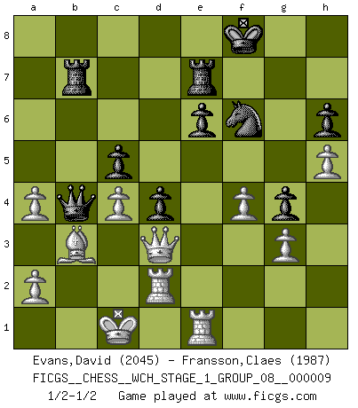 Last move : 1/2-1/2 2011 June 10 10:32:2 [Event "FICGS__CHESS__WCH_STAGE_1_GROUP_08__000009"] [Site "FICGS"] [Date "2011.04.01"] [Round "1"] [White "Evans,David"] [Black "Fransson,Claes"] [Result "1/2-1/2"] [WhiteElo "2045"] [BlackElo "1987"] 1.e4 e6 2.d4 d5 3.Nc3 Nf6 4.Bg5 Be7 5.e5 Nfd7 6.h4 h6 7.Qh5 a6 8.O-O-O c5 9.Nf3 Nc6 10.Ne2 cxd4 11.Nexd4 g6 12.Bxe7 Qxe7 13.Nxc6 bxc6 14.Qg4 Rb8 15.Rh3 c5 16.c4 d4 17.h5 g5 18.Re1 Rg8 19.Nd2 Bb7 20.Bd3 Bc6 21.Bh7 Rg7 22.Bc2 Kf8 23.Ra3 Rb6 24.Rg3 Ba8 25.Qe2 Bc6 26.Ne4 Qd8 27.f4 Bxe4 28.Qxe4 f6 29.exf6 Nxf6 30.Qf3 g4 31.Qf2 Qd6 32.Rd3 Rgb7 33.b3 a5 34.g3 Re7 35.Rd2 a4 36.bxa4 R6b7 37.Qe2 Qb6 38.Bb3 Qb4 39.Qd3 1/2-1/2 French : Albin-Alekhine-Chatard attack Queenside Castling by player White (move 8) This chess game ended in a draw. Follow this game move after move (download)Look at Garry Kasparov. After he loses, invariably he wins the next game. He just kills the next guy. That's something that we have to learn to be able to do. (Maurice Ashley) Du weisst es gibt ein Problem mit Computern und Fernschach, wenn jeder eine Rating von 2450 hat. (John Christen Knudsen) ¿Porque tengo que perder ante este idiota?. (Aron Nimzovich) Si le désir cupide (et stupide) de gagner est une inépuisable source de souffrance, une combinaison brillante sur l'échiquier est une découverte : le coquelicot qui s'épanouit lorsque apparaît la Voie Lactée. (Arrabal) The various flowers seem good to different people. (Chinese proverb)
