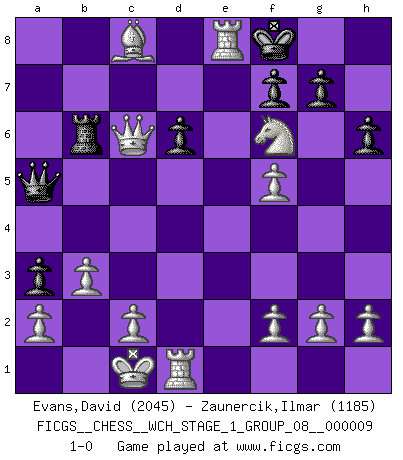Last move : 1-0 2011 April 23 9:44:49 [Event "FICGS__CHESS__WCH_STAGE_1_GROUP_08__000009"] [Site "FICGS"] [Date "2011.04.01"] [Round "1"] [White "Evans,David"] [Black "Zaunercik,Ilmar"] [Result "1-0"] [WhiteElo "2045"] [BlackElo "1185"] 1.e4 c5 2.Nf3 d6 3.d4 cxd4 4.Nxd4 Nc6 5.Nc3 Nf6 6.Bg5 h6 7.Bxf6 exf6 8.Bb5 Bd7 9.Nf5 Bxf5 10.exf5 a6 11.Bc4 Ne5 12.Bb3 Be7 13.Qd5 O-O 14.Qxb7 Re8 15.O-O-O a5 16.Ba4 Rf8 17.Nd5 Nd7 18.Bxd7 Rb8 19.Qc6 a4 20.Rhe1 a3 21.b3 Qa5 22.Rxe7 Rfc8 23.Bxc8 Rb6 24.Nxf6+ Kf8 25.Re8+ 1-0 Sicilian Kingside Castling by player Black (move 13) Queenside Castling by player White (move 15) Player White won this chess game. Follow this game move after move (download)Whoever sees no other aim in the game than that of giving checkmate to one's opponent will never become a good Chess player. (Euwe) Wenn ich Weiß habe gewinne ich weil ich Weiß habe, wenn ich Schwarz habe gewinne ich weil ich Bogoljubov bin. (Efim Bogoljubov) Fischer sacrificó virtualmente todo lo que la mayoría de nosotros los 'debiles' (término que él usa) valoramos, respetamos y apreciamos por el amor de un astuto, a menudo hermoso tablero de juego, por el privilegio ambivalente de ser su mas grande maestro. (Paul Kollar) Que feriez-vous si vous étiez en train de jouer aux échecs et que la fin du monde arrive ? Je continuerais à jouer. (Saint Borromée) Always remember that you are unique; just like everyone else. (Unknown)