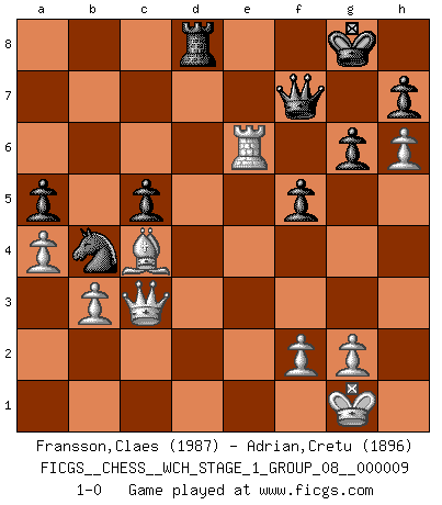 Last move : 1-0 2011 August 30 19:30:11 [Event "FICGS__CHESS__WCH_STAGE_1_GROUP_08__000009"] [Site "FICGS"] [Date "2011.04.01"] [Round "1"] [White "Fransson,Claes"] [Black "Adrian,Cretu"] [Result "1-0"] [WhiteElo "1987"] [BlackElo "1896"] 1.d4 Nf6 2.Nf3 g6 3.c4 Bg7 4.Nc3 d5 5.cxd5 Nxd5 6.e3 O-O 7.Bc4 Nb6 8.Be2 Nc6 9.O-O Be6 10.h3 a6 11.b3 Nd5 12.Na4 Bf5 13.Bb2 b6 14.Rc1 Na7 15.Ne5 f6 16.Nd3 Bxd3 17.Qxd3 Nb5 18.Nc3 Nbxc3 19.Bxc3 Qd7 20.Bd2 f5 21.Bf3 e6 22.Rfe1 Bh6 23.Rc4 a5 24.h4 Rac8 25.Qc2 Kh8 26.a3 Rf7 27.a4 Bf8 28.e4 Nb4 29.Qb1 c5 30.exf5 exf5 31.Bc3 Bg7 32.Rd1 Qe7 33.h5 Bf6 34.h6 R7f8 35.dxc5 Bxc3 36.Rxc3 Qf6 37.Re3 bxc5 38.Qc1 Rc7 39.Qc4 R7c8 40.Re6 Qf7 41.Qc3+ Kg8 42.Be2 Rcd8 43.Rxd8 Rxd8 44.Bc4 1-0 King's Indian : East Indian defense Kingside Castling by player Black (move 6) Kingside Castling by player White (move 9) Player White won this chess game. Follow this game move after move (download)Avoid the crowd. Do your own thinking independently. Be the Chess player, not the Chess piece. (Ralph Charell) Schach ist mein Leben, meine Leidenschaft, was ich gelernt habe und seit meinem 14. Lebensjahr profimässig praktiziere. Darauf zu verzichten, würde mir sehr schwer fallen. (Viktor Kortschnoi) El Ajedrez es la vida. (Bobby Fischer) Des points faibles ou des trous dans la position de l'adversaire doivent être occupés par des pièces et non pas par des pions. (Siegbert Tarrasch) Memory is a way of holding onto the things you love, the things you are, the things you never want to lose. (from the television show: The Wonder Years)