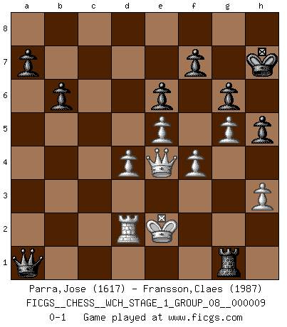 Last move : 0-1 2011 July 20 0:3:17 [Event "FICGS__CHESS__WCH_STAGE_1_GROUP_08__000009"] [Site "FICGS"] [Date "2011.04.01"] [Round "1"] [White "Parra,Jose"] [Black "Fransson,Claes"] [Result "0-1"] [WhiteElo "1617"] [BlackElo "1987"] 1.e4 e6 2.d4 d5 3.e5 c5 4.c3 Nc6 5.f4 Nh6 6.Nf3 Qb6 7.Bd3 cxd4 8.cxd4 Bd7 9.Bc2 Nb4 10.O-O Nxc2 11.Qxc2 Nf5 12.Rd1 Rc8 13.Nc3 Bb4 14.g4 Ne7 15.Be3 Qa6 16.Rdc1 Bxc3 17.bxc3 Bb5 18.Kf2 Bd3 19.Qb2 h5 20.h3 Be4 21.g5 Nf5 22.Qe2 Bd3 23.Qd2 Rc6 24.Ne1 Be4 25.Nc2 Qa4 26.Nb4 Rc7 27.Nd3 b6 28.Ke1 O-O 29.Nf2 Rfc8 30.Nxe4 dxe4 31.Rab1 Nxe3 32.Qxe3 Qa5 33.Kf1 Rxc3 34.Rxc3 Rxc3 35.Qxe4 Qa6+ 36.Ke1 Qxa2 37.Qa8+ Kh7 38.Qe4+ g6 39.Rd1 Rg3 40.Rd2 Qa1+ 41.Ke2 Rg1 0-1 French : Advance variation Kingside Castling by player White (move 10) Kingside Castling by player Black (move 28) Player Black won this chess game. Follow this game move after move (download)Nothing excites jaded Grandmasters more than a theoretical novelty. (Dominic Lawson) Versuche, dich von der Sklaverei der Eröffnungsvarianten zu befreien. Stattdessen soll man gewisse Typenpositionen erlernen, die man eingehend analysiert. (Aaron Nimzowitsch) a manera como él juega al Ajedrez, demuestra la completa naturaleza de un hombre. (Stanley Ellin) Les réformistes prétendent que les progrès de la théorie conduiront à la disparition des échecs, et qu'il faut, pour leur rendre vie, en remanier les règles. En réalité, qu'exprime cette affirmation? Le mépris de l'intuition, de l'imagination et de tous les autres éléments qui font des échecs un art. (Alexander Alekhine) Men should grow up. - Yeah. And dogs should stop licking themselves. It's not gonna happen. (Gregory House to Dr. Cameron, House M.D.)