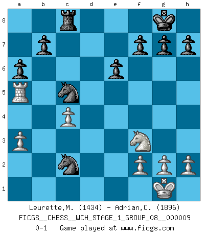 Last move : 0-1 2011 May 31 20:37:25 [Event "FICGS__CHESS__WCH_STAGE_1_GROUP_08__000009"] [Site "FICGS"] [Date "2011.04.01"] [Round "1"] [White "Leurette,Marc-Antoine"] [Black "Adrian,Cretu"] [Result "0-1"] [WhiteElo "1434"] [BlackElo "1896"] 1.e4 c5 2.Nf3 d6 3.Bb5+ Bd7 4.Bxd7+ Qxd7 5.O-O Nc6 6.d4 cxd4 7.Nxd4 Nf6 8.Nc3 e6 9.Nf3 Be7 10.Be3 O-O 11.e5 dxe5 12.Bg5 Qxd1 13.Raxd1 Rfd8 14.b3 Rac8 15.Rxd8+ Nxd8 16.Bd2 Nc6 17.Re1 Bb4 18.Ne4 Nxe4 19.Bxb4 Nxb4 20.c4 Nc5 21.a3 Nc2 22.Rxe5 Nxb3 23.Rb5 Nc5 24.Ra5 a6 0-1 Sicilian : Canal-Sokolsky attack, 3...Bd7 Kingside Castling by player White (move 5) Kingside Castling by player Black (move 10) Player Black won this chess game. Follow this game move after move (download)I have never in my life played the French Defence, which is the dullest of all openings. (Wilhelm Steinitz) Jeder leidlich begabte Spieler, er braucht keineswegs hervorragend veranlagt zu sein, kann es zum Meister bringen. Aber das ist ja auch gar nicht nötig! Der richtige Standpunkt ist es, zu seinem Vergnügen zu spielen, und man glaube ja nicht, dass der Genuss proportional dem Können sei. (Siegbert Tarrasch) ¿Que sería del Ajedrez sin errores graciosos?. (Kurt Richter) A chaque perte on perd un peu de soi. (Joël Lautier) Don't be irreplaceable, if you can't be replaced, you can't be promoted. (Dan Rotaru)