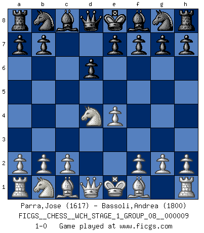 Last move : 1-0 2011 May 10 18:0:17 [Event "FICGS__CHESS__WCH_STAGE_1_GROUP_08__000009"] [Site "FICGS"] [Date "2011.04.01"] [Round "1"] [White "Parra,Jose"] [Black "Bassoli,Andrea"] [Result "1-0"] [WhiteElo "1617"] [BlackElo "1800"] 1.e4 c5 2.Nf3 d6 3.d4 cxd4 4.Nxd4 1-0 This chess game has been lost on time (started : 2011.04.01 10:12:50) Sicilian Player White won this chess game. Follow this game move after move (download)In Chess, as it is played by masters, chance is practically eliminated. (Emanuel Lasker) Ich moechte nie einem Club beitreten, der Leute wie mich als Mitglieder aufnimmt. (Woody Allen) Nada excita más a Grandes Maestros aburridos que una novedad teórica. (Dominic Lawson) Le succès, c'est être capable d'aller d'échec en échec sans perdre son enthousiasme. (Winston Churchill) The only thing that matters is the evidence. (Horatio Caine, C.S.I. Miami)