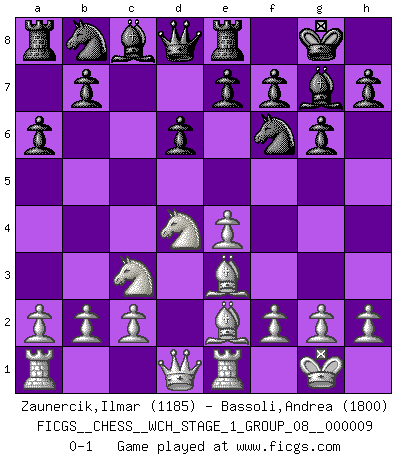 Last move : 0-1 2011 June 18 19:52:5 [Event "FICGS__CHESS__WCH_STAGE_1_GROUP_08__000009"] [Site "FICGS"] [Date "2011.04.01"] [Round "1"] [White "Zaunercik,Ilmar"] [Black "Bassoli,Andrea"] [Result "0-1"] [WhiteElo "1185"] [BlackElo "1800"] 1.e4 c5 2.Nf3 d6 3.d4 cxd4 4.Nxd4 Nf6 5.Nc3 g6 6.Be2 Bg7 7.O-O O-O 8.Re1 a6 9.Be3 Re8 0-1 This chess game has been lost on time (started : 2011.04.01 10:12:50) Sicilian : Dragon variation Kingside Castling by player White (move 7) Kingside Castling by player Black (move 7) Player Black won this chess game. Follow this game move after move (download)The passed pawn is a criminal, who should be kept under lock and key. Mild measures, such as police surveillance, are not sufficient. (Nimzovitch) Ich verachte Kasparow. (Viktor Kortschnoi) El Ajedrez es una guerra en un tablero. El objetivo es aplastar la mente del oponente. (Bobby Fischer) Shah mat. Le roi est mort. Cri de fierté d'un joueur venant de terrasser son adversaire, courtoisement, sans effusion de sang. Train yourself to let go of everything you fear to lose. (Master Yoda in Star Wars ep.3)