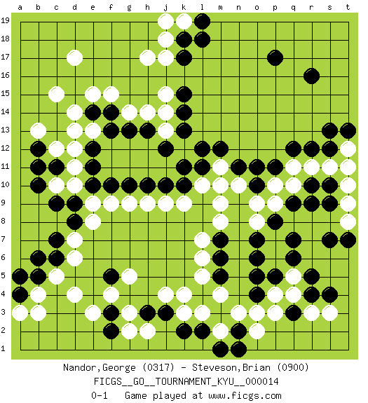 Last move : 0-1 2007 January 29 7:45:19 [Event "FICGS__GO__TOURNAMENT_KYU__000014"] [Site "FICGS"] [Date "2006.12.15"] [Round "1"] [Black "Nandor,George"] [White "Steveson,Brian"] [Result "0-1"] [Rating 1 "0317"] [Rating 2 "0900"] 1.r16 d17 2.q3 d4 3.r5 k4 4.r10 c15 5.p17 d10 6.k17 o3 7.o5 h17 8.f3 e3 9.j3 k3 10.k10 k12 11.m10 j15 12.k15 j14 13.k14 j13 14.l12 j4 15.h3 g5 16.h10 j9 17.j10 k9 18.k13 m8 19.o10 p4 20.p5 q4 21.r4 q5 22.q6 p7 23.o7 o8 24.m3 p6 25.o6 m2 26.n2 n3 27.o4 p3 28.q7 r3 29.p8 o9 30.l2 m4 31.k2 l3 32.k11 p9 33.q9 p10 34.p11 m9 35.j12 n10 36.o11 m11 37.n11 l10 38.m12 h9 39.g10 g9 40.f10 f9 41.e12 d12 42.e14 d14 43.c6 c5 44.c9 c10 45.f5 f4 46.b10 g3 47.f2 g2 48.c11 c12 49.b12 b13 50.e10 d11 51.b11 e9 52.b5 b4 53.b6 d6 54.m1 s3 55.s4 o2 56.n1 h2 57.c7 d7 58.h13 h14 59.g13 g14 60.f14 f15 61.m7 l7 62.m6 l6 63.d9 q10 64.r9 q11 65.q12 r11 66.r12 s11 67.s12 t8 68.s9 t9 69.s7 e15 70.d8 e8 71.a4 a3 72.a5 b3 73.t7 t10 74.s10 e13 75.f13 d13 76.e11 j18 77.k18 k19 78.l19 j19 79.l18 t12 80.t13 t11 81.s13 j17 82.l11 m10 83.m5 l5 0-1 Here are the names of the openings (joseki) played in the four corners : Corner d4 : d4 f3 Hoshi (Hwajeom, Seongjeom, Xingwei`) 4-4 Point. The star or hoshi (4-4) point, emphasizing influence at the potential expense of territory. Ikken Kakari (Hankan Keolch'im, Yi Gua`jiao~, 1-Space Low Approach). Black 2 is the standard approach move to the 4-4. Player White won this Go (weiqi, baduk) game. Follow this game move after move (download)If a formation is symmetrical, play at the center. (Anonymous) Man is still the most extraordinary computer of all. (John F. Kennedy)