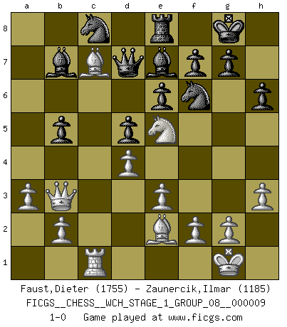 Last move : 1-0 2011 June 19 8:45:6 [Event "FICGS__CHESS__WCH_STAGE_1_GROUP_08__000009"] [Site "FICGS"] [Date "2011.04.01"] [Round "1"] [White "Faust,Dieter"] [Black "Zaunercik,Ilmar"] [Result "1-0"] [WhiteElo "1755"] [BlackElo "1185"] 1.d4 d5 2.c4 e6 3.Nc3 Nf6 4.Bg5 c6 5.e3 Nbd7 6.cxd5 cxd5 7.Bd3 Be7 8.Nf3 O-O 9.h3 a6 10.O-O b5 11.Qb3 Bb7 12.a3 h6 13.Bf4 Rc8 14.Rac1 Re8 15.Rc2 Ne4 16.Be2 Nef6 17.Rfc1 Nb6 18.Nxb5 axb5 19.Rxc8 Nxc8 20.Bc7 Qd7 21.Ne5 1-0 QGD : 4.Bg5 Kingside Castling by player Black (move 8) Kingside Castling by player White (move 10) Player White won this chess game. Follow this game move after move (download)What is the object of playing a gambit opening?... To acquire a reputation of being a dashing player at the cost of losing a game. (Siegbert Tarrasch) Schach ist gnadenlos. Du mußt bereit sein zu töten. (Nigel Short) Cada Peón es una Reina en potencia. (James Mason) Les pièces de l'échiquier étaient impitoyables. Elles le retenaient, elles l'absorbaient. Il y avait de l'horreur en cela, mais aussi une harmonie unique. Car, qu'y a-t-il dans le monde, à part les échecs ? (V. Nabokov) Strategy without tactics is the slowest route to victory. Tactics without strategy is the noise before defeat. (Sun Tzu)