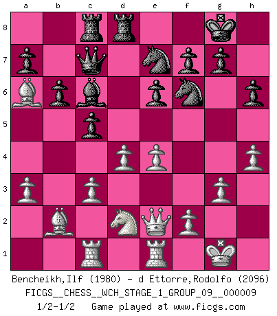 Last move : 1/2-1/2 2011 July 20 14:27:34 [Event "FICGS__CHESS__WCH_STAGE_1_GROUP_09__000009"] [Site "FICGS"] [Date "2011.04.01"] [Round "1"] [White "Bencheikh,Ilf"] [Black "d Ettorre,Rodolfo"] [Result "1/2-1/2"] [WhiteElo "1980"] [BlackElo "2096"] 1.d4 Nf6 2.c4 e6 3.Nc3 Bb4 4.e3 O-O 5.Bd3 c5 6.Nf3 d5 7.O-O Nc6 8.a3 Bxc3 9.bxc3 dxc4 10.Bxc4 Qc7 11.Bb5 b6 12.Re1 Bb7 13.e4 Ne7 14.Bd3 h6 15.Bb2 Rfd8 16.Qe2 Rac8 17.Rac1 Ng6 18.g3 Qd7 19.Rcd1 Qc7 20.Nd2 Ne7 21.h4 Qd7 22.Bb5 Qc7 23.Rc1 Bc6 24.Ba6 1/2-1/2 Nimzo-Indian : 4.e3 O-O, 5.Bd3 Kingside Castling by player Black (move 4) Kingside Castling by player White (move 7) This chess game ended in a draw. Follow this game move after move (download)Fischer is completely natural. He plays no roles. He's like a child. Very, very simple. (Zita Rajcsanyi) Im Schach gewinnt jeder. Hat man Freunde am Spiel - und das ist die Hauptsache - ist auch der Verlust einer Partie kein Unglück. (David Bronstein) Aún deseo matar a Fischer. (Boris Spassky) Les échecs, c'est la lutte contre l'erreur. (Johannes Zukertort) Life is like internet, nothing interesting, but noone want to leave it. (Ilmars Cirulis)