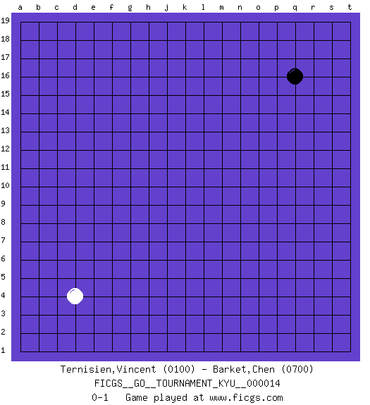 Last move : 0-1 2007 January 15 18:22:56 [Event "FICGS__GO__TOURNAMENT_KYU__000014"] [Site "FICGS"] [Date "2006.12.15"] [Round "1"] [Black "Ternisien,Vincent"] [White "Barket,Chen"] [Result "0-1"] [Rating 1 "0100"] [Rating 2 "0700"] 1.q16 d4 0-1 This go game has been lost on time (started : 2006.12.15 2:14:43) Here are the names of the openings (joseki) played in the four corners : Corner d4 : d4 0-1 Hoshi (Hwajeom, Seongjeom, Xingwei`) 4-4 Point. The star or hoshi (4-4) point, emphasizing influence at the potential expense of territory. Player White won this Go (weiqi, baduk) game. Follow this game move after move (download)Learn to play under the stones. (Anonymous) Empty your mind, be formless, shapeless — like water. (Bruce Lee)