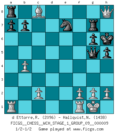 Last move : 1/2-1/2 2011 May 26 16:7:49 [Event "FICGS__CHESS__WCH_STAGE_1_GROUP_09__000009"] [Site "FICGS"] [Date "2011.04.01"] [Round "1"] [White "d Ettorre,Rodolfo"] [Black "Hallqvist,Niklas"] [Result "1/2-1/2"] [WhiteElo "2096"] [BlackElo "1438"] 1.e4 e6 2.d4 d5 3.Nc3 Bb4 4.e5 c5 5.a3 Bxc3+ 6.bxc3 Qa5 7.Bd2 Ne7 8.Qg4 O-O 9.Bd3 Nbc6 10.Nf3 f5 11.exf6 Rxf6 12.Qh5 Nf5 13.dxc5 Qxc5 14.O-O Rf7 15.Ng5 g6 16.Qg4 Re7 17.c4 h5 18.Qd1 dxc4 19.Bb4 Nxb4 20.axb4 Qd6 21.Bxc4 Qf4 22.Qd8+ Kg7 23.Bxe6 Qxg5 24.Qg8+ Kh6 25.Qh8+ Rh7 26.Qf8+ Rg7 27.Bxc8 Ne7 28.Qh8+ 1/2-1/2 French : Winawer, Advance variation Kingside Castling by player Black (move 8) Kingside Castling by player White (move 14) This chess game ended in a draw. Follow this game move after move (download)Chess is a cold bath for the mind. (Sir John Simon) Kleine Schachspieler machen Mist, und große Schachspieler machen Mist, aber große machen weniger Mist. (Fritz Sämisch) Preferería tener un Peón que un dedo. (Reuben Fine) Botvinnik disait en comparant les échecs à la musique: Il existe une science dont le but est l'étude de l'acoustique et des sons. Mais il y a aussi un art qui se sert de l'océan des sons : c'est la musique. De toute évidence, il en est de même pour la pensée. La logique est l'étude des lois de la réflexion et les échecs reflètent, en tant qu'art, le côté logique de la réflexion, sous la forme d'images artistiques... Extrait de Fischer - Spassky, Reykjavik 1972 par Alexander & F. Wyndham (Ed. Solar), p 37. A proverb is a short sentence based on long experience. (Miguel de Cervantes)