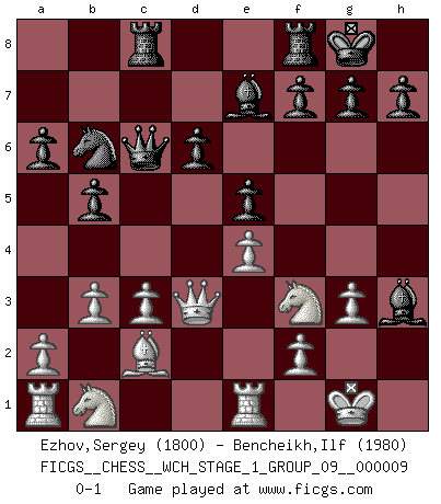Last move : 0-1 2011 June 12 7:35:55 [Event "FICGS__CHESS__WCH_STAGE_1_GROUP_09__000009"] [Site "FICGS"] [Date "2011.04.01"] [Round "1"] [White "Ezhov,Sergey"] [Black "Bencheikh,Ilf"] [Result "0-1"] [WhiteElo "1800"] [BlackElo "1980"] 1.e4 e5 2.Nf3 Nc6 3.Bb5 a6 4.Ba4 Nf6 5.O-O Be7 6.Re1 b5 7.Bb3 d6 8.c3 O-O 9.d4 Bg4 10.d5 Na5 11.Bc2 Qc8 12.h3 Bd7 13.Bg5 c6 14.dxc6 Qxc6 15.Bxf6 Bxf6 16.Qd3 Nc4 17.b3 Nb6 18.Nbd2 Rac8 19.Nb1 Be7 20.g3 Bxh3 0-1 This chess game has been lost on time (started : 2011.04.01 10:16:8) Ruy Lopez : Closed Kingside Castling by player White (move 5) Kingside Castling by player Black (move 8) Player Black won this chess game. Follow this game move after move (download)Alekhine is a poet who creates a work of art out of something that would hardly inspire another man to send home a picture post card. (Max Euwe) Rauchen ist dem Schachspieler bei seiner Arbeit, also im Wettkampf, untersagt. (Viktor Kortschnoi) El Ajedrez demanda una total concentración. (Bobby Fischer) Les pièces de l'échiquier étaient impitoyables. Elles le retenaient, elles l'absorbaient. Il y avait de l'horreur en cela, mais aussi une harmonie unique. Car, qu'y a-t-il dans le monde, à part les échecs ? (V. Nabokov) The good fighters of old first put themselves beyond the possibility of defeat, and then waited for an opportunity of defeating the enemy. (Sun Tzu)