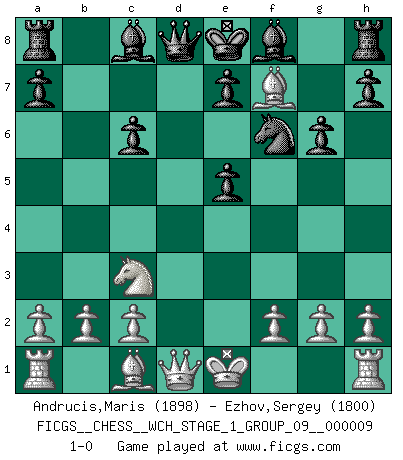 Last move : 1-0 2011 May 18 21:30:21 [Event "FICGS__CHESS__WCH_STAGE_1_GROUP_09__000009"] [Site "FICGS"] [Date "2011.04.01"] [Round "1"] [White "Andrucis,Maris"] [Black "Ezhov,Sergey"] [Result "1-0"] [WhiteElo "1898"] [BlackElo "1800"] 1.e4 c5 2.Nc3 Nc6 3.Nf3 d6 4.Bc4 Nf6 5.d4 cxd4 6.Nxd4 g6 7.Nxc6 bxc6 8.e5 dxe5 9.Bxf7+ 1-0 Sicilian : Closed, 2...Nc6 Player White won this chess game. Follow this game move after move (download)A chess genius has died; a loss for humanity. (Viktor Kortchnoi, about Bobby Fischer's death) Ich moechte nie einem Club beitreten, der Leute wie mich als Mitglieder aufnimmt. (Woody Allen) Las piezas de Ajedrez son los bloques del alfabeto que moldean los pensamientos; y esos pensamientos, aunque hagan un diseño visual en el tablero, expresan abstractamente su belleza como un poema. (Marcel Duchamp) La tactique, c'est ce que vous faites quand il y a quelque chose à faire; la stratégie, c'est ce que vous faites quand il n'y a rien à faire. (Savielli Tartacower) If you are good, you will be assigned all the work. If you are really good, you will get out of it. (Dan Rotaru)
