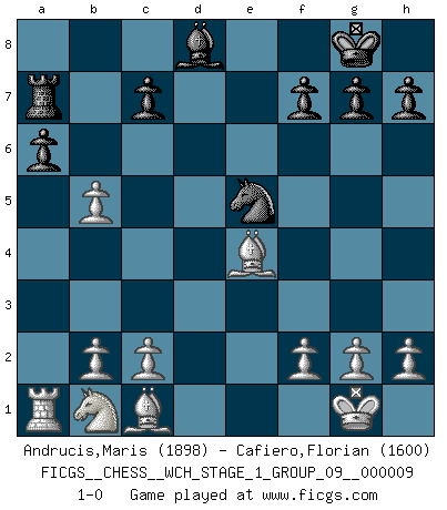 Last move : 1-0 2011 May 14 19:48:40 [Event "FICGS__CHESS__WCH_STAGE_1_GROUP_09__000009"] [Site "FICGS"] [Date "2011.04.01"] [Round "1"] [White "Andrucis,Maris"] [Black "Cafiero,Florian"] [Result "1-0"] [WhiteElo "1898"] [BlackElo "1600"] 1.e4 e5 2.Nf3 Nc6 3.Bb5 a6 4.Ba4 Nf6 5.O-O Nxe4 6.d4 b5 7.Bb3 d6 8.Bd5 Bb7 9.Bxe4 Be7 10.dxe5 dxe5 11.Nxe5 Qxd1 12.Rxd1 Nxe5 13.Bxb7 Ra7 14.Be4 O-O 15.a4 Rd8 16.Rxd8+ Bxd8 17.axb5 1-0 Ruy Lopez : Open, 7.Bb3 Kingside Castling by player White (move 5) Kingside Castling by player Black (move 14) Player White won this chess game. Follow this game move after move (download)You need not play well - just help your opponent to play badly. (Genrikh Chepukaitis) Ich verachte Kasparow. (Viktor Kortschnoi) Con o sin el título, Bobby Fischer fue sin lugar a dudas el mas grande jugador de su época. (Burt Hochberg) Donnez-moi un Cavalier en 6e et je gagnerais toutes mes parties. (Steinitz) The faster the computer, the slower the brain. (Thibault de Vassal)