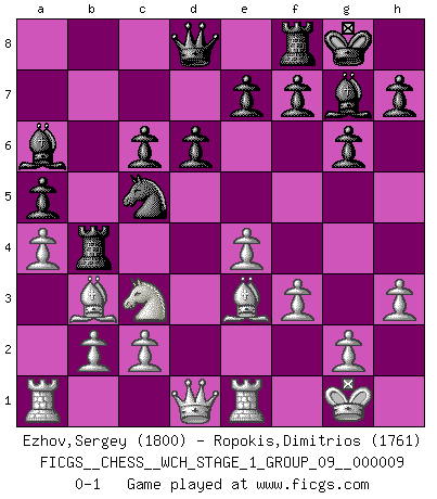 Last move : 0-1 2011 June 10 7:25:32 [Event "FICGS__CHESS__WCH_STAGE_1_GROUP_09__000009"] [Site "FICGS"] [Date "2011.04.01"] [Round "1"] [White "Ezhov,Sergey"] [Black "Ropokis,Dimitrios"] [Result "0-1"] [WhiteElo "1800"] [BlackElo "1761"] 1.e4 c5 2.Nf3 g6 3.d4 Bg7 4.Nc3 cxd4 5.Nxd4 Nc6 6.Nxc6 bxc6 7.Bc4 d6 8.O-O Nf6 9.Re1 O-O 10.Bg5 Rb8 11.Bb3 Nd7 12.Be3 a5 13.a4 Ba6 14.f3 Nc5 15.h3 Rb4 0-1 This chess game has been lost on time (started : 2011.04.01 10:16:8) Sicilian : Hungarian variation Kingside Castling by player White (move 8) Kingside Castling by player Black (move 9) Player Black won this chess game. Follow this game move after move (download)I still hope to kill Fischer. (Boris Spassky) Die Arbeit ist etwas Unnatürliches. Die Faulheit allein ist göttlich. (Anatole France) La esencia del Ajedrez es pensar acerca de lo que el Ajedrez es. (David Bronstein) Même si l'adversaire joue le coup analysé précédemment, recommencez l'analyse en voyant la nouvelle position. Première règle de Blumenfeld Somewhere in the world there is an epigram for every dilemma. (Hendrik Willem van Loon)
