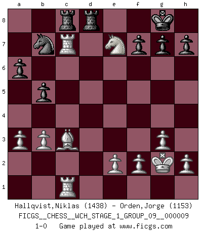 Last move : 1-0 2011 June 7 10:40:13 [Event "FICGS__CHESS__WCH_STAGE_1_GROUP_09__000009"] [Site "FICGS"] [Date "2011.04.01"] [Round "1"] [White "Hallqvist,Niklas"] [Black "Orden,Jorge"] [Result "1-0"] [WhiteElo "1438"] [BlackElo "1153"] 1.Nf3 Nf6 2.c4 c5 3.g3 e6 4.Bg2 Be7 5.O-O O-O 6.Nc3 a6 7.b3 d5 8.cxd5 Nxd5 9.Nxd5 exd5 10.d4 Nc6 11.Bb2 b5 12.dxc5 Bxc5 13.Rc1 Qe7 14.Qxd5 Nb4 15.Qxc5 Qxc5 16.Rxc5 Bb7 17.a3 Nc6 18.Rfc1 Na5 19.Nd4 Bxg2 20.Kxg2 Rfd8 21.Rc7 Rab8 22.Bc3 Nb7 23.Nc6 Rbc8 24.Ne7+ 1-0 Reti Opening Kingside Castling by player White (move 5) Kingside Castling by player Black (move 5) Player White won this chess game. Follow this game move after move (download)If Chess is a science, it's a most inexact one. If Chess is an art, it is too exacting to be seen as one. If Chess is a sport, it's too esoteric. If Chess is a game, it's too demanding to be just a game. If Chess is a mistress, she's a demanding one. If Chess is a passion, it's a rewarding one. If Chess is life, it's a sad one. (Unknown) Wenn Capablanka heute auf der Schachbühne erscheinen würde, hätte er ein halbes Jahr gebraucht um sich die Schachtheorie anzueignen. Und dann hätte er alles und jeden besiegt. (Mikhail Moiseyevich Botvinik) El Ajedrez es parte de la cultura, y si una cultura esta en decadencia, entonces también el Ajedrez declinará. (Mikhail Botvinnik) Une platitude souvent récitée à propos des Echecs est qu'une des choses les plus difficiles à réaliser est de gagner une position gagnante. Cela ne manque pas de sens mais, pour ma part, j'ai toujours trouvé plus difficile de gagner une position perdante. (Tim Krabbe) Remember : Your focus determines your reality. (Qui-Gon Jinn in Star Wars ep.1)