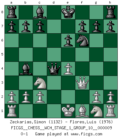 Last move : 0-1 2011 April 17 0:25:1 [Event "FICGS__CHESS__WCH_STAGE_1_GROUP_10__000009"] [Site "FICGS"] [Date "2011.04.01"] [Round "1"] [White "Zeckarias,Simon"] [Black "Flores,Luis"] [Result "0-1"] [WhiteElo "1132"] [BlackElo "1976"] 1.d4 Nf6 2.Nc3 d5 3.Bg5 Nbd7 4.Bxf6 Nxf6 5.f3 e6 6.e4 dxe4 7.fxe4 Bb4 8.Qf3 Qxd4 0-1 Queen's pawn game Player Black won this chess game. Follow this game move after move (download)Mistrust is the most necessary characteristic of the Chess player. (Siegbert Tarrasch) Irgendwie scheint mir sonntags früh um 9 Uhr der Killerinstinkt verloren gegangen zu sein. (Alexej Shirov) La esencia del Ajedrez es pensar acerca de lo que el Ajedrez es. (David Bronstein) La tactique est l'élément le plus important du milieu de jeu. (Siegbert Tarrasch) Ah, beer! The cause of, and the solution to, all of life's problems. (Homer Simpson)