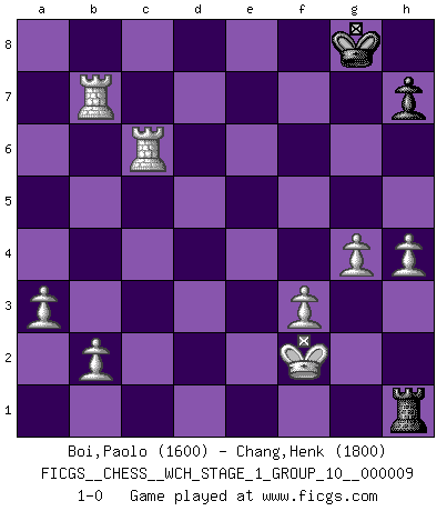 Last move : 1-0 2011 June 15 18:21:11 [Event "FICGS__CHESS__WCH_STAGE_1_GROUP_10__000009"] [Site "FICGS"] [Date "2011.04.01"] [Round "1"] [White "Boi,Paolo"] [Black "Chang,Henk"] [Result "1-0"] [WhiteElo "1600"] [BlackElo "1800"] 1.d4 Nf6 2.c4 g6 3.Nc3 Bg7 4.e4 d6 5.f3 O-O 6.Be3 e5 7.d5 Nh5 8.Qd2 f5 9.exf5 gxf5 10.Bd3 Kh8 11.Nge2 a5 12.Ng3 Qh4 13.Bg5 Qd4 14.Nxh5 f4 15.Nxg7 Kxg7 16.Bh4 Qe3+ 17.Qxe3 fxe3 18.Ke2 Na6 19.Kxe3 Nb4 20.Be4 Bf5 21.Rhc1 Bxe4 22.Nxe4 Rae8 23.a3 Na6 24.c5 dxc5 25.Nxc5 Nxc5 26.Rxc5 Rf7 27.Rac1 Rc8 28.d6 c6 29.Rxa5 Rd7 30.Be7 Kf7 31.Rxe5 Rg8 32.g4 Rg6 33.Rc4 Rh6 34.Rf4+ Kg8 35.h4 Rhxd6 36.Bxd6 Rxd6 37.Re8+ Kg7 38.Re7+ Kg8 39.Rxb7 Rd1 40.Rf6 Re1+ 41.Kf2 Rh1 42.Rxc6 1-0 King's Indian : Saemisch, Orthodox, 7.d5 Kingside Castling by player Black (move 5) Player White won this chess game. Follow this game move after move (download)Even the laziest King flees wildly in the face of a double check ! (Aaron Nimzowitsch) Ein unbeabsichtigtes Patt ist der Gipfel der Dummheit. (Anonymous) Botvinnik trataba de restarle el misterio al Ajedrez, siempre relacionandolo a situaciones de la vida ordinaria. El gustaba de llamar al Ajedrez un típico problema inexacto similar a aquellos de los cuales la gente siempre tiene que enfrentarse en la vida cotidiana. (Garry Kasparov) Ce qui caractérise les parties de combat, c'est que si le défenseur a constamment de difficiles problèmes à résoudre, l'attaquant doit chercher sans relâche de nouvelles possibilités d'attaque. (Koblentz) The large trees attract high winds. (Chinese proverb)