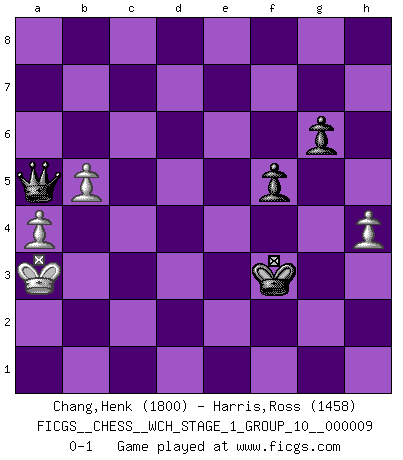 Last move : 0-1 2011 April 26 20:35:5 [Event "FICGS__CHESS__WCH_STAGE_1_GROUP_10__000009"] [Site "FICGS"] [Date "2011.04.01"] [Round "1"] [White "Chang,Henk"] [Black "Harris,Ross"] [Result "0-1"] [WhiteElo "1800"] [BlackElo "1458"] 1.e4 c6 2.d4 d5 3.exd5 cxd5 4.c4 Nf6 5.Nc3 e6 6.Bg5 Be7 7.Nf3 Nc6 8.Be2 O-O 9.O-O b6 10.Rc1 Bb7 11.cxd5 Nxd5 12.Bxe7 Ncxe7 13.Bd3 Nxc3 14.Rxc3 Nd5 15.Rc1 Qf6 16.Qe2 Nf4 17.Qe3 Nxd3 18.Qxd3 Bxf3 19.Qxf3 Qxd4 20.Qb3 Rac8 21.Rfd1 Rxc1 22.Rxc1 Rd8 23.g3 g6 24.Qa3 a5 25.Qe7 Qd6 26.Qf6 e5 27.Qf3 Kg7 28.Kg2 Qd5 29.Qxd5 Rxd5 30.Rc6 b5 31.Ra6 a4 32.Rb6 e4 33.Kf1 Rc5 34.Ke1 f5 35.Rb7+ Kf6 36.Kd2 Kg5 37.Rxh7 Kg4 38.Rh4+ Kf3 39.Rf4+ Kg2 40.h4 Rd5+ 41.Kc3 Rd3+ 42.Kc2 Rf3 43.Rxf3 Kxf3 44.Kc3 Kxf2 45.Kb4 e3 46.Kxb5 e2 47.Kxa4 e1Q 48.b4 Qe8+ 49.b5 Qa8+ 50.Kb3 Qa5 51.a4 Kxg3 52.Ka3 Kf3 0-1 Caro-Kann : Panov-Botvinnik attack, 5...e6 Kingside Castling by player Black (move 8) Kingside Castling by player White (move 9) 10 pieces endgame at move 46 : White KPPPP , Black KPPPP WHITE : King + 4 Pawns BLACK : King + 4 Pawns 9 pieces endgame at move 47 : White KPPPP , Black KPPP WHITE : King + 4 Pawns BLACK : King + 3 Pawns Promotion Queen by player Black (move 47) 8 pieces endgame at move 51 : White KPPP , Black KQPP WHITE : King + 3 Pawns BLACK : King + 1 Queen 2 Pawns Player Black won this chess game. Follow this game move after move (download)Up to this point White has been following well-known analysis. But now he makes a fatal error: he begins to use his own head. (Siegbert Tarrasch) Jeder Fehler erscheint unglaublich dumm, wenn andre ihn begehen. (Georg Christoph Lichtenberg) Ser exitoso en el Ajedrez te permite descubrir tu propia personalidad. Eso es lo que deseo para los niños de mi clase. (Saudin Robovic) On n'a jamais que l'âge auquel on a commence à jouer aux échecs car après on cesse de vieillir. (Capablanca) The Internet is the world's largest library. It's just that all the books are on the floor. (John Allen Paulos)