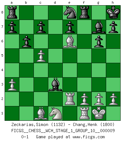Last move : 0-1 2011 April 14 14:39:32 [Event "FICGS__CHESS__WCH_STAGE_1_GROUP_10__000009"] [Site "FICGS"] [Date "2011.04.01"] [Round "1"] [White "Zeckarias,Simon"] [Black "Chang,Henk"] [Result "0-1"] [WhiteElo "1132"] [BlackElo "1800"] 1.c4 Nf6 2.Nc3 g6 3.d4 Bg7 4.e4 O-O 5.e5 Ne8 6.Nf3 d6 7.b4 b6 8.c5 dxc5 9.dxc5 Qxd1+ 10.Nxd1 Nc6 11.Bc4 Nxb4 12.O-O Bg4 13.a3 Nc2 14.Ra2 Bxf3 15.e6 fxe6 16.Bxe6+ Kh8 17.Rxc2 Be4 18.Re2 Bd3 0-1 English Opening Kingside Castling by player Black (move 4) Kingside Castling by player White (move 12) Player Black won this chess game. Follow this game move after move (download)To avoid losing a piece, many a person has lost the game. (Savielly Tartakover) Der Vorposten provoziert a) eine Basis für neue Angriffe und b) eine Schwächung der gegnerischen Widerstandskraft in der fraglichen Linie. (Aaron Nimzowitsch) Es el objetivo de la escuela moderna no tratar cada posición de acuerdo a una regla general, sino de acuerdo al principio inherente en la posición. (Richard Reti) Mais l'homme est une créature légère et illogique : semblable au joueur d'échecs, il n'aime que le processus du but à atteindre, non le but lui-même. (Dostoïevsky) Never risk one's whole fortune unless supported by one's entire army. (Niccolo Machiavelli)