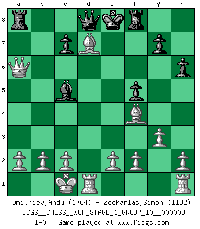 Last move : 1-0 2011 May 21 18:14:7 [Event "FICGS__CHESS__WCH_STAGE_1_GROUP_10__000009"] [Site "FICGS"] [Date "2011.04.01"] [Round "1"] [White "Dmitriev,Andy"] [Black "Zeckarias,Simon"] [Result "1-0"] [WhiteElo "1764"] [BlackElo "1132"] 1.d4 f5 2.g3 Nf6 3.Bg2 Nc6 4.d5 Ne5 5.Nc3 e6 6.Qd4 d6 7.dxe6 Bxe6 8.Bxb7 Rb8 9.Qxa7 Nfd7 10.Nf3 Nxf3+ 11.Bxf3 d5 12.Nxd5 Rc8 13.Bf4 Bxd5 14.Bxd5 Bc5 15.Qa6 Rf8 16.Be6 h6 17.O-O-O Ra8 18.Bxd7+ 1-0 Dutch defense Queenside Castling by player White (move 17) Player White won this chess game. Follow this game move after move (download)When I asked Fischer why he had not played a certain move in our game, he replied: 'Well, you laughed when I wrote it down !' (Mikhail Tal) Korrekt heißt in Deutschland die Haltung eines Mannes, dessen Benehmen nach dem Urteile seiner Nachbarn seiner Stellung angemessen ist. Um korrekt zu sein, muß man sich der Meinung der anderen anpassen... (Emanuel Lasker) Cuando no sepas que mover, espera por una idea que se le venga a la la cabeza de tu oponente. Tenlo por seguro de que esa idea estará incorrecta. (Siegbert Tarrasch) J'ai vu le vaincu d'Echecs jouer des années durant dans l'espoir de la fête de la victoire. Car tu es plus riche de ce qu'elle existe si même elle n'est point pour toi. Ainsi de la perle du fond des mers. (Antoine de Saint-Exupéry) The question of whether computers can think is just like question of whether submarines can swim. (Edsger W. Dijkstra)