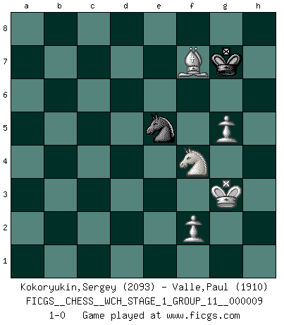 Last move : 1-0 2011 June 4 2:51:20 [Event "FICGS__CHESS__WCH_STAGE_1_GROUP_11__000009"] [Site "FICGS"] [Date "2011.04.01"] [Round "1"] [White "Kokoryukin,Sergey"] [Black "Valle,Paul"] [Result "1-0"] [WhiteElo "2093"] [BlackElo "1910"] 1.d4 g5 2.Bxg5 c5 3.e3 Bg7 4.c3 Nf6 5.Nd2 d5 6.Ngf3 cxd4 7.exd4 Bf5 8.Qb3 O-O 9.Qxb7 Nbd7 10.Bf4 e5 11.dxe5 Nc5 12.Qb4 Nfd7 13.Be3 Rb8 14.Qf4 Bc2 15.Nb3 Qc8 16.Qg4 Nxb3 17.axb3 Rxb3 18.e6 fxe6 19.Qxe6+ Kh8 20.Ba6 Qd8 21.O-O Rxb2 22.Be2 Bf5 23.Qxd5 Nb6 24.Qxd8 Rxd8 25.Rxa7 Bxc3 26.Ng5 Rd7 27.Rxd7 Nxd7 28.Bf3 Rb4 29.Rc1 Bd4 30.Bxd4+ Rxd4 31.Re1 h6 32.Ne6 Rd6 33.Nf4 Nf6 34.h3 Kg8 35.g4 Rd4 36.Ne2 Rd3 37.Kg2 Bd7 38.Ra1 Rd6 39.Nf4 Be8 40.h4 Bf7 41.Kg3 Kf8 42.g5 hxg5 43.hxg5 Nd7 44.Rd1 Rxd1 45.Bxd1 Ne5 46.Bh5 Kg7 47.Bxf7 1-0 Queen's pawn Kingside Castling by player Black (move 8) Kingside Castling by player White (move 21) 10 pieces endgame at move 43 : White KRBNPP , Black KRBN WHITE : King + 1 Rook 1 Bishop 1 Knight 2 Pawns BLACK : King + 1 Rook 1 Bishop 1 Knight 9 pieces endgame at move 44 : White KBNPP , Black KRBN WHITE : King + 1 Bishop 1 Knight 2 Pawns BLACK : King + 1 Rook 1 Bishop 1 Knight 8 pieces endgame at move 45 : White KBNPP , Black KBN WHITE : King + 1 Bishop 1 Knight 2 Pawns BLACK : King + 1 Bishop 1 Knight 7 pieces endgame at move 47 : White KBNPP , Black KN WHITE : King + 1 Bishop 1 Knight 2 Pawns BLACK : King + 1 Knight Player White won this chess game. Follow this game move after move (download)Chess mastery essentially consists of analyzing Chess positions accurately. (Mikhail Botvinnik) Ich habe die besten Aussichten, den ersten Preis zu gewinnen - denn jeder muss gegen Steinitz spielen, nur ich nicht! (Wilhelm Steinitz) El estómago es una parte esencial del maestro de Ajedrez. (Bent Larsen) La guerre est enfant de la passion, la passion est enfant du narcissisme et le narcissisme est l'enfant. (...) Une autre partie ? (Thibault de Vassal) There is a very easy way to return from a casino with a small fortune : go there with a large one. (Jack Yelton)