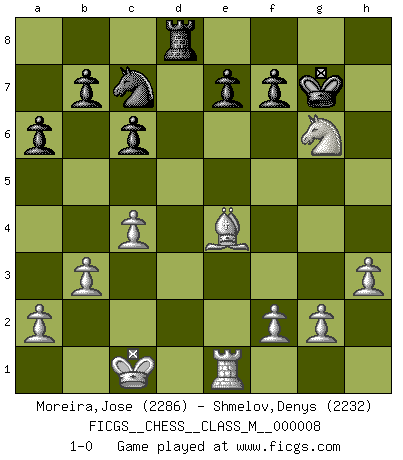 Last move : 1-0 2007 April 27 18:55:51 [Event "FICGS__CHESS__CLASS_M__000008"] [Site "FICGS"] [Date "2006.12.16"] [Round "1"] [White "Moreira,Jose"] [Black "Shmelov,Denys"] [Result "1-0"] [WhiteElo "2286"] [BlackElo "2232"] 1.e4 c6 2.Nc3 d5 3.Qf3 dxe4 4.Nxe4 Nd7 5.d4 Ngf6 6.Bd3 Nxe4 7.Qxe4 Nf6 8.Qe5 Qd5 9.Nf3 Qxe5+ 10.dxe5 Nd5 11.c4 Nc7 12.h3 g6 13.Be3 Bg7 14.O-O-O h6 15.Rd2 Be6 16.b3 a6 17.Bc5 Rd8 18.Bb6 Rd7 19.Re1 Na8 20.Be3 O-O 21.Nd4 Nc7 22.Be4 Bxe5 23.Nxe6 Rxd2 24.Nxf8 Rd8 25.Bxh6 Bg7 26.Bxg7 Kxg7 27.Nxg6 1-0 This chess game has been lost on time (started : 2006.12.16 17:16:4) Caro-Kann : GOldman (Spielmann) variation Queenside Castling by player White (move 14) Kingside Castling by player Black (move 20) Player White won this chess game. Follow this game move after move (download)Suddenly it was obvious to me in my analysis I had missed what Fischer had found with the greatest of ease at the board. (Mikhail Botvinnik) Es hat in meinem Leben Zeiten gegeben, in denen das Schachspiel, wenn nicht zum Lebenszweck, so doch zu einem regelrechten Lebensersatz geworden ist. Man fühlt sich in solchen Zeiten nicht so, als besäße man eine göttliche Gabe, sondern eher so, als sei man von ihr besessen. (Garry Kasparov) El tablero es el mundo, las piezas es el fenomeno del universo, las reglas del juego son lo que llamamos leyes de la naturaleza y el jugador del lado opuesto, se encuentra oculto a nuestra vista. (Thomas Huxley) La tactique est l'élément le plus important du milieu de jeu. (Siegbert Tarrasch) The best weapon against an enemy is another enemy. (Friedrich Nietzsche)