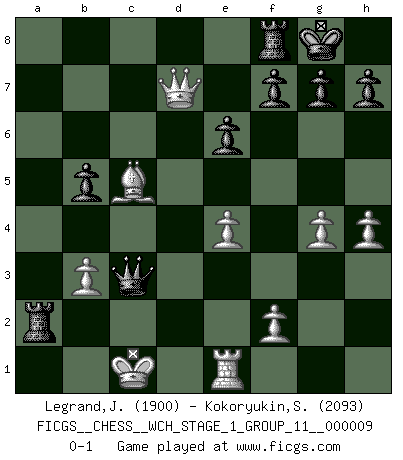Last move : 0-1 2011 June 18 15:15:5 [Event "FICGS__CHESS__WCH_STAGE_1_GROUP_11__000009"] [Site "FICGS"] [Date "2011.04.15"] [Round "1"] [White "Legrand,Jonathan"] [Black "Kokoryukin,Sergey"] [Result "0-1"] [WhiteElo "1900"] [BlackElo "2093"] 1.e4 c5 2.Nf3 Nc6 3.d4 cxd4 4.Nxd4 Nf6 5.Nc3 d6 6.Bc4 e6 7.Be3 Be7 8.Qe2 O-O 9.O-O-O Qc7 10.Bb3 a6 11.g4 Nxd4 12.Rxd4 Nd7 13.h4 Bf6 14.Qc4 Nc5 15.R4d1 b5 16.Qb4 Bd7 17.Rxd6 Qxd6 18.Bxc5 Qf4+ 19.Be3 Qf3 20.Re1 a5 21.Qd6 a4 22.Qxd7 axb3 23.cxb3 Bxc3 24.bxc3 Rxa2 25.Bc5 Qxc3+ 0-1 Sicilian defense Kingside Castling by player Black (move 8) Queenside Castling by player White (move 9) Player Black won this chess game. Follow this game move after move (download)Fischer prefers to enter Chess history alone. (Miguel Najdorf) Wenn es im Universum noch irgendwo intelligente Lebewesen gibt, dann kennen sie Go. (Emanuel Lasker) Personalmente, yo prefiero mirar hacia el futuro en donde un programa de computadora gane el título mundial de Ajedrez. La humanidad necesita una lección de humildad. (Richard Dawkings) Une platitude souvent récitée à propos des Echecs est qu'une des choses les plus difficiles à réaliser est de gagner une position gagnante. Cela ne manque pas de sens mais, pour ma part, j'ai toujours trouvé plus difficile de gagner une position perdante. (Tim Krabbe) Logic : The art of thinking and reasoning in strict accordance with the limitations and incapacities of the human misunderstanding. (Ambrose Bierce)