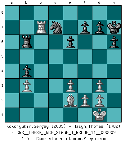 Last move : 1-0 2011 August 3 21:9:5 [Event "FICGS__CHESS__WCH_STAGE_1_GROUP_11__000009"] [Site "FICGS"] [Date "2011.04.01"] [Round "1"] [White "Kokoryukin,Sergey"] [Black "Hasyn,Thomas"] [Result "1-0"] [WhiteElo "2093"] [BlackElo "1782"] 1.d4 Nf6 2.c4 e6 3.Nf3 d5 4.Nc3 Be7 5.Bf4 O-O 6.e3 c5 7.dxc5 Bxc5 8.Be2 dxc4 9.Bxc4 a6 10.Bd3 Nbd7 11.Qc2 b5 12.Ne5 h6 13.O-O Bb7 14.Rfd1 Qe7 15.Nxd7 Nxd7 16.a4 b4 17.Ne4 Rac8 18.Bg3 Rfd8 19.a5 Ba7 20.Qe2 Bxe4 21.Bxe4 Nc5 22.Bf3 Nb3 23.Rab1 Bb8 24.Rxd8+ Qxd8 25.Qxa6 Bxg3 26.hxg3 Nxa5 27.Rd1 Qc7 28.Rd6 Rb8 29.Qd3 Nc4 30.Rc6 Ne5 31.Rxc7 Nxd3 32.b3 Ne5 33.Be2 Rb6 34.Rc8+ Kh7 35.Rc5 Nd7 36.Rc7 1-0 This chess game has been lost on time (started : 2011.04.01 10:20:35) Queen's pawn game Kingside Castling by player Black (move 5) Kingside Castling by player White (move 13) Player White won this chess game. Follow this game move after move (download)The beauty of a move lies not in its' appearance but in the thought behind it. (Siegbert Tarrasch) Rauchen ist dem Schachspieler bei seiner Arbeit, also im Wettkampf, untersagt. (Viktor Kortschnoi) La última cosa en que Fischer estaba interesado era en tonterías, siempre y cuando el Ajedrez estuviera involucrado. (Elie Agur) Le profane ne songe pas à la somme de jouissance dont il se prive, qui méconnaît ce jeu aux ressources aussi variées que passionnantes. (Jean-Marie Jeanton-Lamarche) I don't know, I don't care, and it doesn't make any difference. (Albert Einstein)