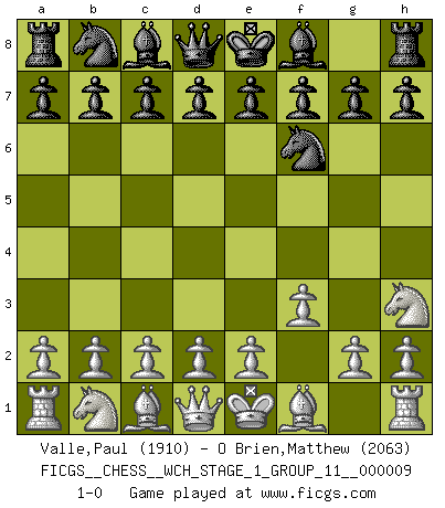 Last move : 1-0 2011 May 17 18:12:57 [Event "FICGS__CHESS__WCH_STAGE_1_GROUP_11__000009"] [Site "FICGS"] [Date "2011.04.01"] [Round "1"] [White "Valle,Paul"] [Black "O Brien,Matthew"] [Result "1-0"] [WhiteElo "1910"] [BlackElo "2063"] 1.Nh3 Nf6 2.f3 1-0 This chess game has been lost on time (started : 2011.04.01 10:20:35) Amar (Paris) Opening Player White won this chess game. Follow this game move after move (download)A great player and a great example for many. His book My 60 Memorable Games had a big impact on me. It is a shame he didn't continue to enrich the world of chess with his unparalleled understanding after 1972. (Jan Timman, about Bobby Fischer's death) Ich bin es gewohnt, das die Jugend mir überhaupt keinen Respekt entgegenbringt. (Alexander Morozewich) El tablero es el mundo, las piezas es el fenomeno del universo, las reglas del juego son lo que llamamos leyes de la naturaleza y el jugador del lado opuesto, se encuentra oculto a nuestra vista. (Thomas Huxley) Les échecs, c'est l'art d'analyser. (Mikhail Botvinnik) Chess, like love, like music, has the power to make people happy. (Siegbert Tarrasch)
