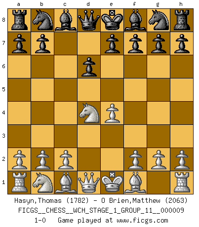 Last move : 1-0 2011 May 26 6:44:44 [Event "FICGS__CHESS__WCH_STAGE_1_GROUP_11__000009"] [Site "FICGS"] [Date "2011.04.01"] [Round "1"] [White "Hasyn,Thomas"] [Black "O Brien,Matthew"] [Result "1-0"] [WhiteElo "1782"] [BlackElo "2063"] 1.e4 c5 2.Nf3 d6 3.d4 cxd4 4.Nxd4 1-0 This chess game has been lost on time (started : 2011.04.01 10:20:35) Sicilian Player White won this chess game. Follow this game move after move (download)You need not play well - just help your opponent to play badly. (Genrikh Chepukaitis) Offensichtlich kennt Kasparow nichts anderes als Schach, und ich könnte 500 weitere Spieler dieser Sorte benennen. (Judith Polgar) Los asuntos humanos son como una partida de Ajedrez: solo aquellos que no lo toman seriamente, pueden ser llamados buenos jugadores. (Hung Tzu Ch'eng) Les Echecs, c'est l'art de la guerre sans les charniers, c'est la résurrection des morts tombés au champ d'honneur, l'espoir perpétuel, la suprématie de l'intelligence sur la force, la culture de l'esprit. (F. Szpiner) They say poker is a zero-sum game. It must be, because every time I play my sum ends up zero. (Max Shapiro)