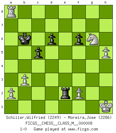 Last move : 1-0 2007 January 29 0:14:34 [Event "FICGS__CHESS__CLASS_M__000008"] [Site "FICGS"] [Date "2006.12.16"] [Round "1"] [White "Schiller,Wilfried"] [Black "Moreira,Jose"] [Result "1-0"] [WhiteElo "2249"] [BlackElo "2286"] 1.d4 Nf6 2.c4 g6 3.g3 Bg7 4.Bg2 O-O 5.Nc3 d6 6.Nf3 Nc6 7.O-O a6 8.d5 Na5 9.Nd2 c5 10.Qc2 Rb8 11.b3 b5 12.Rb1 Bf5 13.e4 Bd7 14.Bb2 h5 15.Ne2 Qc7 16.Nf4 h4 17.gxh4 Rb7 18.h5 Nxh5 19.Nxh5 Bxb2 20.Qxb2 gxh5 21.Kh1 f6 22.Bf3 Bg4 23.Rg1 Kf7 24.Bxg4 hxg4 25.Rxg4 Ke8 26.Rbg1 Kd7 27.cxb5 Rxb5 28.Rg7 Kc8 29.Qc3 Qd8 30.Nf3 Rb4 31.Nh4 Rxe4 32.Ng6 Re8 33.Qd3 Rb4 34.Qxa6+ Rb7 35.Rg4 Kb8 36.Ra4 Ra7 37.Qb5+ Rb7 38.Qxa5 Qxa5 39.Rxa5 e6 40.Rxb7+ Kxb7 41.dxe6 Rxe6 42.h4 Kb6 43.Ra8 Re2 44.h5 1-0 King's Indian : 3.g3 Kingside Castling by player Black (move 4) Kingside Castling by player White (move 7) Player White won this chess game. Follow this game move after move (download)The enormous mental resilience, without which no Chess player can exist, was so much taken up by Chess that he could never free his mind of this game. (Albert Einstein) Ein Gewinn durch eine ungenaue Kombination, sei sie auch noch so vorzeigbar, erfüllt mich mit Schaudern. (Wilhelm Steinitz) El jugador blanco perdió porque fallo en recordar la coreccta continuación y tuvo que pensar por sí mismo las movidas. (Siegbert Tarrasch) Le thème de l'attaque double intervient d'une manière ou d'une autre dans l'immense majorité des combinaisons. (Youri Averbakh) The hypothalamus is one of the most important parts of the brain, involved in many kinds of motivation, among other functions. The hypothalamus controls the 'Four Fs: Fighting, Fleeing, Feeding and Mating. (Unknown author)