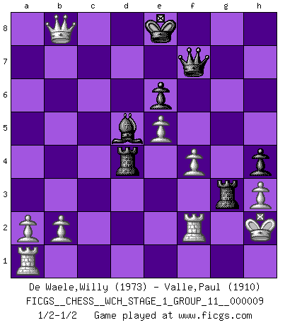 Last move : 1/2-1/2 2011 April 30 22:26:25 [Event "FICGS__CHESS__WCH_STAGE_1_GROUP_11__000009"] [Site "FICGS"] [Date "2011.04.01"] [Round "1"] [White "De Waele,Willy"] [Black "Valle,Paul"] [Result "1/2-1/2"] [WhiteElo "1973"] [BlackElo "1910"] 1.e4 b5 2.Bxb5 c6 3.Be2 d5 4.e5 e6 5.Nf3 c5 6.O-O g5 7.d4 g4 8.Nfd2 cxd4 9.Nb3 Nc6 10.Bb5 Nge7 11.Nxd4 Bd7 12.Bxc6 Nxc6 13.Nxc6 Bxc6 14.Qxg4 h5 15.Qd4 Rg8 16.Be3 Rg4 17.f4 Rc8 18.Rf2 Bb7 19.h3 Rg3 20.Qa4+ Bc6 21.Qxa7 Rc7 22.Qd4 Ba8 23.Kh2 h4 24.Qd2 d4 25.Bxd4 Rd7 26.c3 Bc5 27.Na3 Bxd4 28.cxd4 Rxd4 29.Qe2 Bxg2 30.Nc4 Bd5 31.Nd6+ Kd7 32.Nxf7 Qf8 33.Qa6 Qxf7 34.Qa7+ Ke8 35.Qb8+ Ke7 36.Qd6+ Ke8 37.Qb8+ Kd7 38.Qa7+ Ke8 39.Qb8+ 1/2-1/2 King's pawn Opening Kingside Castling by player White (move 6) This chess game ended in a draw. Follow this game move after move (download)In life, as in Chess, one's own Pawns block one's way. A man's very wealth, ease, leisure, children, books, which should help him to win, more often checkmate him. (Charles Buxton) Fallen sollten polizeilich verboten werden. (Savielly Grigorievitsch Tartakower) El Ajedrez es un mar en el cual un mosquito puede beber y un elefante puede bañarse. (Refrán Hindú) La vie est comme un jeu d'échecs : nous esquissons un plan, mais celui-ci est tributaire de ce que daignent faire l'adversaire aux échecs et le destin dans la vie. (Arthur Schopenhauer) I can't decide which is riskier; taking crazy risks, or taking advice on crazy risks from a crazy risk taker. (Gregory House in House M.D.)