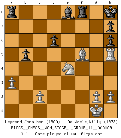Last move : 0-1 2011 June 24 14:8:25 [Event "FICGS__CHESS__WCH_STAGE_1_GROUP_11__000009"] [Site "FICGS"] [Date "2011.04.15"] [Round "1"] [White "Legrand,Jonathan"] [Black "De Waele,Willy"] [Result "0-1"] [WhiteElo "1900"] [BlackElo "1973"] 1.e4 c5 2.Nf3 d6 3.d4 cxd4 4.Nxd4 Nf6 5.Nc3 a6 6.Bc4 e6 7.Bb3 b5 8.O-O Be7 9.Qf3 Qc7 10.Qg3 O-O 11.Bh6 Ne8 12.Rad1 Bd7 13.f4 Nc6 14.Nxc6 Bxc6 15.f5 Kh8 16.f6 gxh6 17.fxe7 Qxe7 18.Qf2 Ng7 19.Qd4 Rfd8 20.Rf3 Qa7 21.a3 Qxd4+ 22.Rxd4 f5 23.Rh3 fxe4 24.Nxe4 Nf5 25.Rb4 a5 26.Bxe6 axb4 27.Bxf5 bxa3 28.bxa3 Rf8 29.Rh5 Be8 0-1 Sicilian : Najdorf, Lipnitzky attack Kingside Castling by player White (move 8) Kingside Castling by player Black (move 10) Player Black won this chess game. Follow this game move after move (download)Let the perfectionist play postal. (Yasser Seirawan) Um sich vor der Gefahr einer Erkältung zu schützen, sorge der wanderlustige König beizeiten für ein brauchbares Versteck. (Aaron Nimzowitsch) Desconfianza es la característica mas necesaria de un jugador de Ajedrez. (Siegbert Tarrasch) Aucun coup ne doit être joué sans but. (Pedro Damiano) Those parts of the system that you can hit with a hammer (not advised) are called hardware; those program instructions that you can only curse at are called software. (Anonymous)