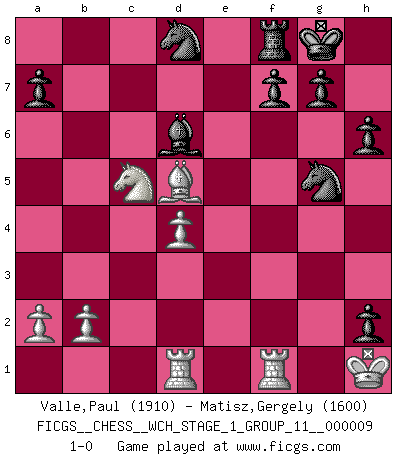 Last move : 1-0 2011 June 25 8:4:29 [Event "FICGS__CHESS__WCH_STAGE_1_GROUP_11__000009"] [Site "FICGS"] [Date "2011.04.01"] [Round "1"] [White "Valle,Paul"] [Black "Matisz,Gergely"] [Result "1-0"] [WhiteElo "1910"] [BlackElo "1600"] 1.Nh3 e5 2.g3 d5 3.f4 Bxh3 4.Bxh3 exf4 5.O-O fxg3 6.e4 gxh2+ 7.Kh1 dxe4 8.Nc3 Nf6 9.d3 Be7 10.Bf4 exd3 11.Qf3 Nbd7 12.Qxb7 O-O 13.Bxc7 Qc8 14.Qc6 Ne5 15.Bxc8 Nxc6 16.Bb7 Rad8 17.Bxd8 Nxd8 18.Bf3 Ne8 19.cxd3 Bd6 20.Bd5 Nc7 21.Bc4 h6 22.d4 Nce6 23.Ne4 Bb8 24.Rad1 Ng5 25.Nc5 Bd6 26.Bd5 1-0 This chess game has been lost on time (started : 2011.04.01 10:20:35) Amar (Paris) Opening Kingside Castling by player White (move 5) Kingside Castling by player Black (move 12) Player White won this chess game. Follow this game move after move (download)When you see a good move, look for a better one. (Emanuel Lasker) Versuche, dich von der Sklaverei der Eröffnungsvarianten zu befreien. Stattdessen soll man gewisse Typenpositionen erlernen, die man eingehend analysiert. (Aaron Nimzowitsch) El jugador táctico sabe que hacer cuando hay algo que hacer; mientras que el estratega sabe que hacer cuando no hay nada que hacer. (Gerald Abrahams) Avant la finale, les dieux ont créé le milieu de partie. (Tarrasch) This is where the fun begins. (Anakin Skywalker in Star Wars ep.3)