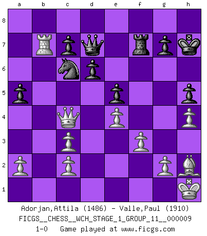 Last move : 1-0 2011 August 22 9:59:38 [Event "FICGS__CHESS__WCH_STAGE_1_GROUP_11__000009"] [Site "FICGS"] [Date "2011.04.01"] [Round "1"] [White "Adorjan,Attila"] [Black "Valle,Paul"] [Result "1-0"] [WhiteElo "1486"] [BlackElo "1910"] 1.e4 b5 2.Bxb5 Bb7 3.d3 f5 4.Nf3 a6 5.Bc4 fxe4 6.dxe4 e6 7.O-O Nc6 8.Bf4 Be7 9.Nc3 Nf6 10.h3 O-O 11.Qd2 Bb4 12.Bd3 Nh5 13.Bh2 Rxf3 14.Be2 Rf8 15.Bxh5 d6 16.Kh1 Qf6 17.Rad1 a5 18.Be2 Ba6 19.Bxa6 Bxc3 20.bxc3 Rxa6 21.Qd3 Rb6 22.Qc4 Qf7 23.Rb1 e5 24.Qa4 Rxb1 25.Rxb1 Qd7 26.Qc4+ Rf7 27.f3 h5 28.h4 Kh7 29.Rb7 1-0 This chess game has been lost on time (started : 2011.04.01 10:20:35) King's pawn Opening Kingside Castling by player White (move 7) Kingside Castling by player Black (move 10) Player White won this chess game. Follow this game move after move (download)The King is a fighting piece. Use it ! (Wilhelm Steinitz) Kombinieren und Schwarzhandel gehören verboten. (Savielly Grigorievitsch Tartakower) Una compensación adecuada por un sacrificio es tener una combinación sólida que conduce a una posición ganadora; una compensación adecuada por una metida de pata es dejar a tu oponente arrebatar una derrota de las fauces de la victoria. (Bruce A. Moon) La tactique est l'élément le plus important du milieu de jeu. (Siegbert Tarrasch) No, I am still playing. (Anatoly Karpov)