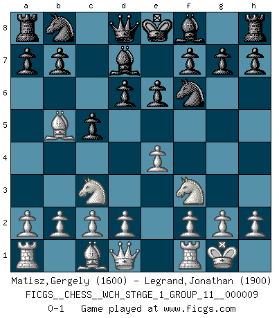 Last move : 0-1 2011 June 21 19:34:27 [Event "FICGS__CHESS__WCH_STAGE_1_GROUP_11__000009"] [Site "FICGS"] [Date "2011.04.15"] [Round "1"] [White "Matisz,Gergely"] [Black "Legrand,Jonathan"] [Result "0-1"] [WhiteElo "1600"] [BlackElo "1900"] 1.e4 c5 2.Nf3 d6 3.Nc3 e6 4.Bb5+ Bd7 5.O-O Nf6 0-1 Sicilian Kingside Castling by player White (move 5) Player Black won this chess game. Follow this game move after move (download)Any material change in a position must come about by mate, a capture, or a Pawn promotion. (Purdy) Es hat in meinem Leben Zeiten gegeben, da ich sehr nahe daran war zu glauben, daß ich auch nicht eine einzige Schachpartie verlieren könnte. (José Raúl Capablanca) Existen dos clases de sacrificios: los correctos y los míos. (Mikhail Tal) Ce qui est bien, c'est d'avoir tout un tas de pièces en prise : l'adversaire ne peut en prendre qu'une à la fois. Cité par Thierry Audin. Hardware: the parts of a computer that can be kicked. (Jeff Persis)