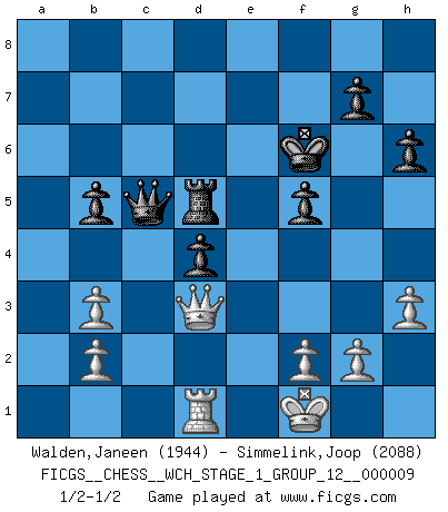 Last move : 1/2-1/2 2011 May 17 12:48:15 [Event "FICGS__CHESS__WCH_STAGE_1_GROUP_12__000009"] [Site "FICGS"] [Date "2011.04.01"] [Round "1"] [White "Walden,Janeen"] [Black "Simmelink,Joop"] [Result "1/2-1/2"] [WhiteElo "1944"] [BlackElo "2088"] 1.e4 e5 2.Nf3 Nc6 3.Bb5 a6 4.Ba4 Nf6 5.O-O Be7 6.Re1 b5 7.Bb3 O-O 8.h3 Bb7 9.d3 d5 10.exd5 Nxd5 11.Nxe5 Nd4 12.Nd2 c5 13.a4 Nf4 14.Nef3 Qd7 15.Re3 Bd6 16.Ne4 Nxb3 17.cxb3 f5 18.Nxd6 Qxd6 19.d4 Rad8 20.Re1 cxd4 21.axb5 axb5 22.Bxf4 Qxf4 23.Re7 Rf7 24.Rxf7 Kxf7 25.Ra7 Qb8 26.Ra1 Kf6 27.Qd3 Bxf3 28.Qxf3 Qc8 29.Rd1 h6 30.Qg3 Qd7 31.Qd3 Qe8 32.Qg3 Rd5 33.Kf1 Qc6 34.Qd3 Qc5 1/2-1/2 Ruy Lopez : Closed, 7...O-O Kingside Castling by player White (move 5) Kingside Castling by player Black (move 7) This chess game ended in a draw. Follow this game move after move (download)Adequate compensation for a sacrifice is having a sound combination leading to a winning position; adequate compensation for a blunder is having your opponent snatch defeat from the jaws of victory. (Bruce A. Moon) Es ist schade, dass viele Schachsportler vergessen, wie wichtig Auftreten und angemessene Kleidung sind. (Alexandra Kosteniuk) Los errores estan ahí, esperando a que se cometan. (Savielly Tartakower) A ce moment-là, je menaçais de comprendre la position ! (Clément L'Heureux) Happy endings are just stories that haven't finished yet. (Jane Smith in Mr & Mrs Smith)