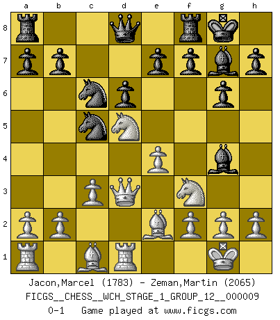 Last move : 0-1 2011 June 26 8:6:11 [Event "FICGS__CHESS__WCH_STAGE_1_GROUP_12__000009"] [Site "FICGS"] [Date "2011.04.01"] [Round "1"] [White "Jacon,Marcel"] [Black "Zeman,Martin"] [Result "0-1"] [WhiteElo "1783"] [BlackElo "2065"] 1.e4 c5 2.d4 cxd4 3.Qxd4 Nc6 4.Qd3 g6 5.Nf3 Bg7 6.Be2 Nf6 7.Nc3 O-O 8.O-O d6 9.Rd1 Bg4 10.Nd5 Nd7 11.c3 Nc5 0-1 This chess game has been lost on time (started : 2011.04.01 10:27:33) Sicilian : Smith-Morra gambit Kingside Castling by player Black (move 7) Kingside Castling by player White (move 8) Player Black won this chess game. Follow this game move after move (download)The most important feature of the Chess position is the activity of the pieces. This is absolutely fundamental in all phases of the game: Opening, Middlegame and especially Endgame. The primary constraint on a piece's activity is the Pawn structure. (Michael Stean) Wie kann ich Remis annehmen? Ich weiß ja gar nicht, wie ich stehe! (Fritz Sämisch) Sin errores no puede haber brillantez. (Emanuel Lasker) Dans le domaine de la peinture, de la gravure et de la sculpture, dès la première décennie de notre siècle, les artistes abandonnent la représentation de la partie d'échecs pour se concentrer sur les pièces, sur les échiquiers et sur toutes les variations auxquelles les unes et les autres peuvent donner lieu. On passe en quelque sorte d'un thème social à un thème musical (au sens de la musica médiévale, c'est-à-dire d'une notion qui inclue le rythme, l'harmonie, la construction et la déconstruction, etc.). Graphiquement et picturalement, l'échiquier apparaît comme une structure ouverte, dynamique, d'une richesse infinie, autorisant toutes les combinatoires et débouchant sur des mouvements et des rythmes de nature exponentielle. (Michel Pastoureau) Humor is by far the most significant activity of the human brain. (Edward De Bono)