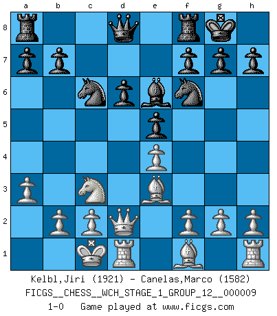 Last move : 1-0 2011 May 28 18:51:33 [Event "FICGS__CHESS__WCH_STAGE_1_GROUP_12__000009"] [Site "FICGS"] [Date "2011.04.01"] [Round "1"] [White "Kelbl,Jiri"] [Black "Canelas,Marco"] [Result "1-0"] [WhiteElo "1921"] [BlackElo "1582"] 1.e4 c5 2.Nf3 Nc6 3.d4 cxd4 4.Nxd4 Nf6 5.Nc3 e5 6.Ndb5 Bb4 7.a3 Bxc3+ 8.Nxc3 O-O 9.Be3 d6 10.Qd2 Be6 11.O-O-O 1-0 This chess game has been lost on time (started : 2011.04.01 10:27:33) Sicilian : Pelikan (Lasker/Sveshnikov) variation Kingside Castling by player Black (move 8) Queenside Castling by player White (move 11) Player White won this chess game. Follow this game move after move (download)Chess is ruthless: you've got to be prepared to kill people. (Nigel Short) Es genügt nicht ein guter Spieler zu sein, man muß auch gut spielen. (Siegbert Tarrasch) ¿Que sería del Ajedrez sin errores graciosos?. (Kurt Richter) Echiquier : carré parfait, comme la Jérusalem nouvelle décrite par l'auteur de l'Apocalypse, huit cases sur huit, exaltation du chiffre 4, symbole du cosmos aux quatre horizons... où le noir et le blanc, l'ombre et la lumière, le mal et le bien s'entremêlent et se conjuguent. (Robert Couffignal, Le Gambit du poète) He who laughs last probably does not get the joke. (Unknown)