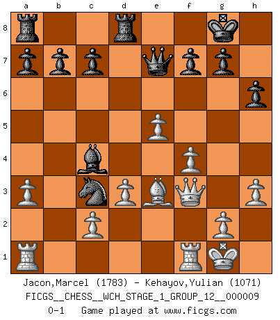 Last move : 0-1 2011 June 7 19:14:32 [Event "FICGS__CHESS__WCH_STAGE_1_GROUP_12__000009"] [Site "FICGS"] [Date "2011.04.01"] [Round "1"] [White "Jacon,Marcel"] [Black "Kehayov,Yulian"] [Result "0-1"] [WhiteElo "1783"] [BlackElo "1071"] 1.e4 e5 2.Nf3 Nc6 3.Bb5 Nf6 4.O-O Bc5 5.Nxe5 O-O 6.Bxc6 dxc6 7.d3 Qe7 8.Nf3 Be6 9.Nc3 h6 10.a3 Rfd8 11.h3 Bb6 12.Qe2 c5 13.Bf4 Nh5 14.Be3 Nf6 15.Ne5 Ba5 16.f4 c4 17.Nxc4 Bxc3 18.bxc3 Bxc4 19.e5 Ne4 20.Qf3 Nxc3 0-1 This chess game has been lost on time (started : 2011.04.01 10:27:33) Ruy Lopez : Berlin defense, Beverwijk variation Kingside Castling by player White (move 4) Kingside Castling by player Black (move 5) Player Black won this chess game. Follow this game move after move (download)Methodical thinking is of more use in Chess than inspiration. (C. J. S. Purdy) Der Traum, für den ich lebe, ist der von einem freien Russland. Viele mögen sagen: Russland hat doch ein Parlament, einen gewählten Präsidenten. Aber ich spüre, dass in meiner Heimat die Angst wiederkehrt. Eine Angst, sich frei zu äußern, bestimmte Dinge zu tun (Garry Kasparov) El jugador táctico sabe que hacer cuando hay algo que hacer; mientras que el estratega sabe que hacer cuando no hay nada que hacer. (Gerald Abrahams) Je fais ceci parce que dans cinquante coups j'obtiendrai cela; je m'appelle Mikhail Moisevitch Botvinnik. (Botvinnik) It's not the size of the dog in the fight, it's the size of the fight in the dog. (Mark Twain)