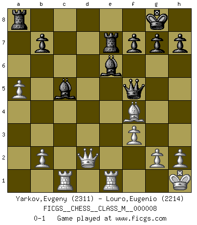 Last move : 0-1 2007 July 13 16:45:58 [Event "FICGS__CHESS__CLASS_M__000008"] [Site "FICGS"] [Date "2006.12.16"] [Round "1"] [White "Yarkov,Evgeny"] [Black "Louro,Eugenio"] [Result "0-1"] [WhiteElo "2311"] [BlackElo "2214"] 1.e4 e5 2.Nf3 Nc6 3.d4 exd4 4.Nxd4 Bc5 5.Be3 Qf6 6.c3 Nge7 7.Bc4 Ne5 8.Be2 Qg6 9.O-O d6 10.f3 O-O 11.Nd2 d5 12.Kh1 Re8 13.Bf4 Qf6 14.Bg3 Bb6 15.a4 a6 16.a5 Ba7 17.Re1 N5c6 18.exd5 Nxd4 19.cxd4 Nxd5 20.Bxa6 Re7 21.Bd3 Bxd4 22.Ne4 Qc6 23.Qb3 Ne3 24.Rac1 Qd5 25.Qb4 c5 26.Qd2 Nf5 27.Bf4 Be6 28.Nxc5 Bxc5 29.Bxf5 Qxf5 0-1 This chess game has been lost on time (started : 2006.12.16 17:16:4) Scotch game Kingside Castling by player White (move 9) Kingside Castling by player Black (move 10) Player Black won this chess game. Follow this game move after move (download)You sit at the board and suddenly your heart leaps. Your hand trembles to pick up the piece and move it. But what Chess teaches you is that you must sit there calmly and think about whether it's really a good idea and whether there are other better ideas. (Stanley Kubrick) Alle Schachspieler sollten auch ein Hobby haben. (Savielly Grigorievitsch Tartakower) Cuando me preguntan: -¿Cual es el secreto que te hace hacer mejores movidas que tus oponentes?, Yo respondo: Me da gusto que me pregunten eso, porque, como veran, hay una simple razón. Yo pienso mis propias movidas y dejo a mi oponente que el piense las suyas. (Alexander Alekhine) Les Echecs, c'est l'art de la guerre sans les charniers, c'est la résurrection des morts tombés au champ d'honneur, l'espoir perpétuel, la suprématie de l'intelligence sur la force, la culture de l'esprit. (F. Szpiner) Man with more than one clock never knows what time it is. (Chinese thought)