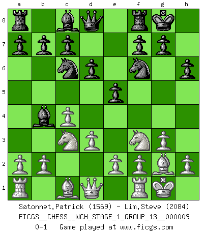 Last move : 0-1 2011 May 13 18:10:29 [Event "FICGS__CHESS__WCH_STAGE_1_GROUP_13__000009"] [Site "FICGS"] [Date "2011.04.01"] [Round "1"] [White "Satonnet,Patrick"] [Black "Lim,Steve"] [Result "0-1"] [WhiteElo "1569"] [BlackElo "2084"] 1.c4 e5 2.Nc3 Nf6 3.Nf3 Nc6 4.g3 Bb4 5.Bg2 O-O 6.O-O d6 7.d3 h6 0-1 This chess game has been lost on time (started : 2011.04.01 10:29:47) English Opening Kingside Castling by player Black (move 5) Kingside Castling by player White (move 6) Player Black won this chess game. Follow this game move after move (download)Many Chess players were surprised when after the game, Fischer quietly explained: 'I had already analyzed this possibility' in a position which I thought was not possible to foresee from the opening. (Mikhail Tal) Die unerbitterlichsten Regeln im Schach sind die Ausnahmen. (Savielly Grigorievitsch Tartakower) El Ajedrez es 99 por ciento táctica. (Teichmann) Le jeu d'échecs est comme rejeté hors du temps. (Antoine de Saint-Exupéry) Now the reason the enlightened prince and the wise general conquer the enemy whenever they move and their achievements surpass those of ordinary men is foreknowledge. (Sun Tzu)